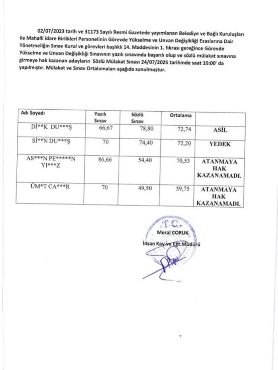 Muğla’nın Dalaman ilçesinde Belediye tarafından Görevde Yükselme ve Unvan Değişikliği sınavı düzenlendi. Belediyenin açıkladığı sınav sonucunda yazılı sınavda yüksek puan alan 2 ismin, sözlü sınavda düşük puan aldığı, yazılı sınavda düşük puan alan 2 ismin ise sözlü sınavda yüksek puan aldığı görüldü. Yazılı sınavda yüksek puan alanlar atanmaya hak kazanamazken, yazılı sınavda en düşük puan alan CHP’li Dalaman Belediye Başkanı Sezer Durmuş’un kardeşi asil, diğer en düşük puan alan Başkan Durmuş’un yengesi ise yedek olarak sınavdan geçmesi dikkat çekti. Yaşanan bu olay tepkiye neden oldu.