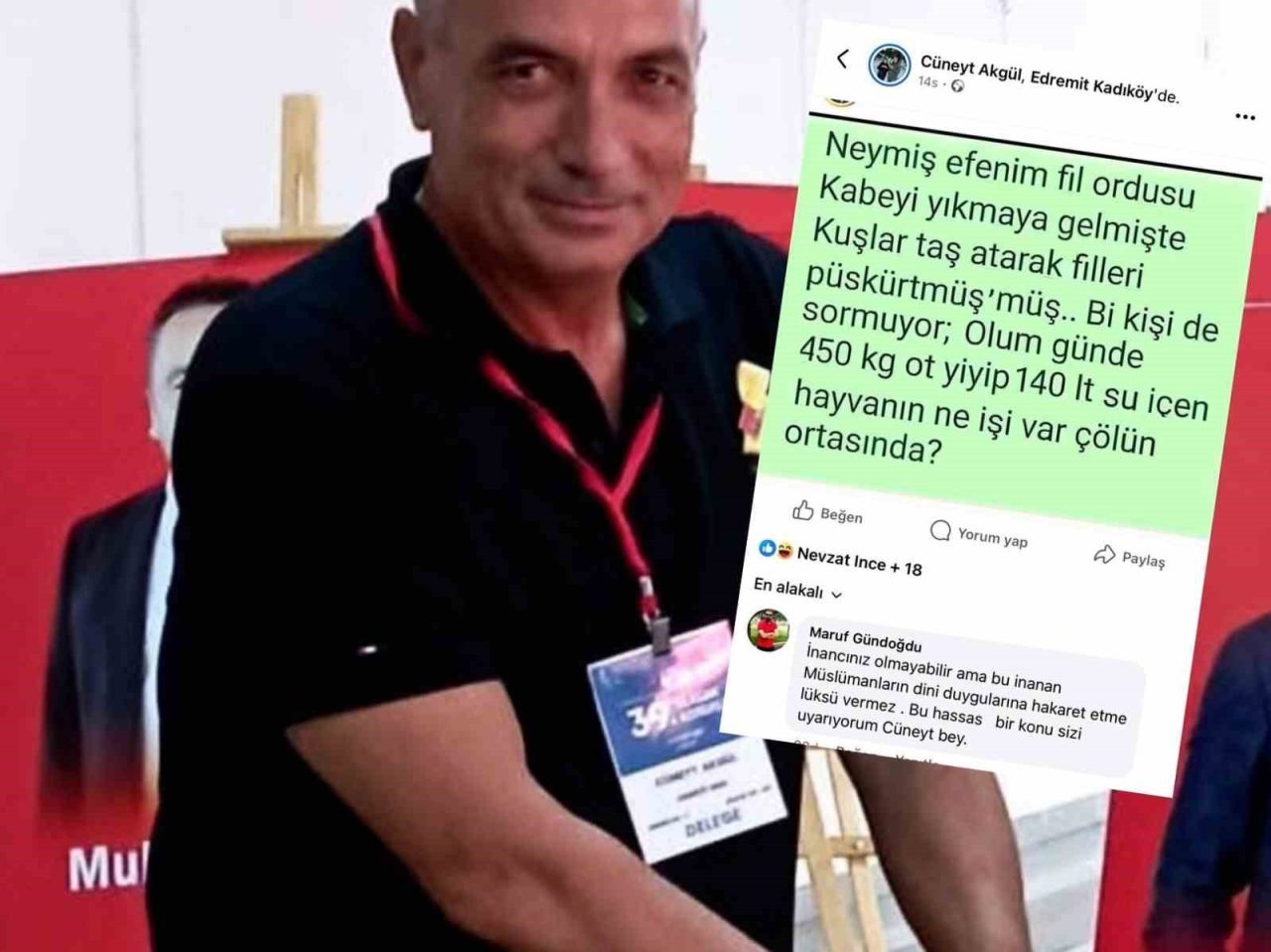 CHP EDREMİT İLÇE BAŞKANLIĞI, KADIKÖY MAHALLE SORUMLUSU CÜNEYT AKGÜL’ÜN SOSYAL MEDYA HESABINDA YAPTIĞI FİL SURESİ’NE ATIFTA BULUNAN ALAYCI PAYLAŞIM SONRASI, AKGÜL’Ü GÖREVDEN UZAKLAŞTIRDI