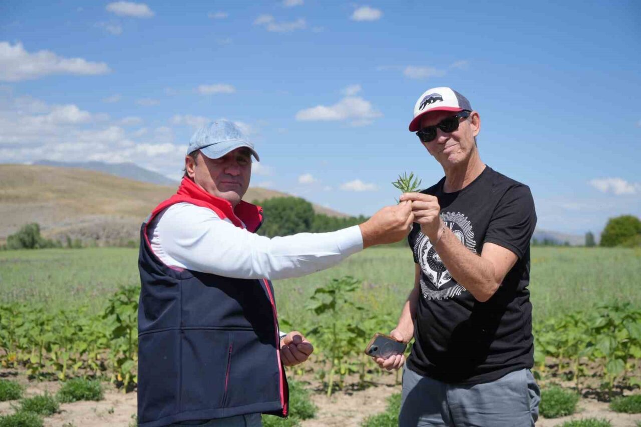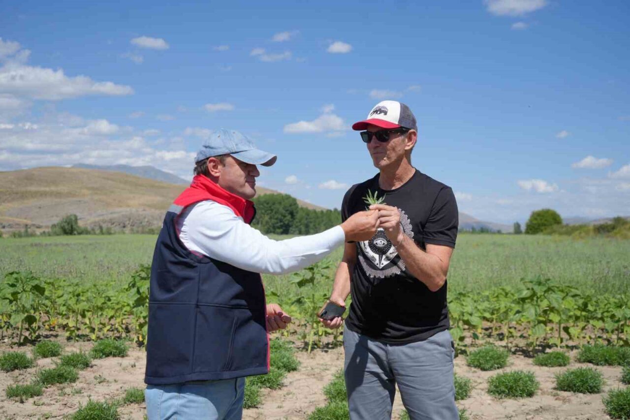 Tarhun tarlalarında yapılan incelemelerde Kevin John Lindseth’e Bayburt İl Tarım ve Orman Müdürü Selami Ersen, İl Müdür Yardımcısı Abdurrahman Müftüoğlu, Koordinasyon Tarımsal Veriler Şube Müdür Vekili Diler Atayeter eşlik etti.