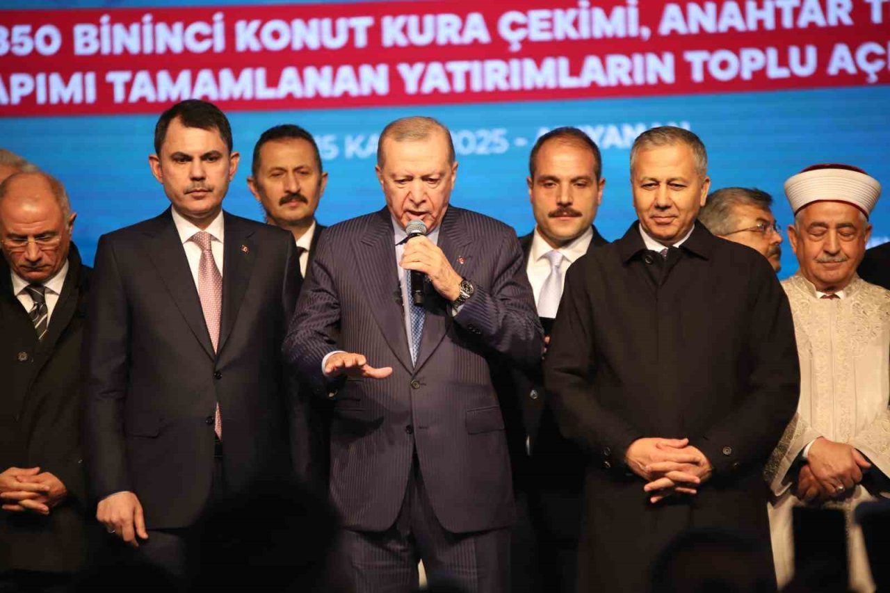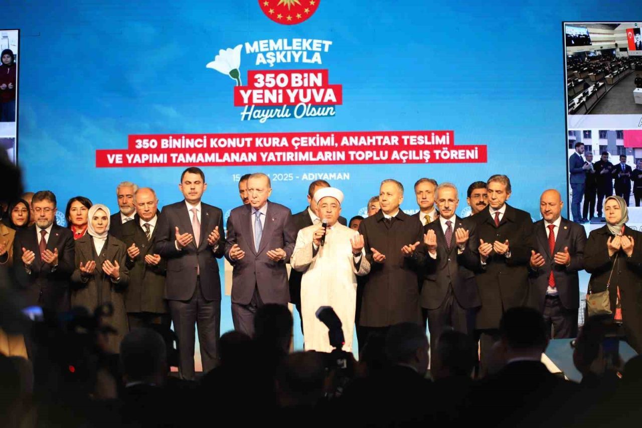 Cumhurbaşkanı Recep Tayyip Erdoğan, Adıyaman’da düzenlenen 350 bininci deprem konutu anahtar teslimi töreninde yaptığı konuşmada, “11 ilimizde toplam 350 bin 178 bağımsız bölümün anahtarlarını hak sahibi kardeşlerimize takdim etmiş oluyoruz” dedi.