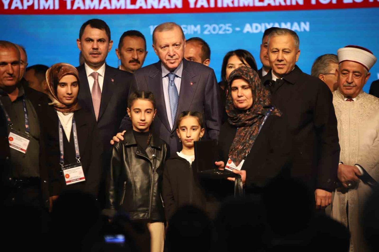 Cumhurbaşkanı Erdoğan, “Sadece enkazları kaldırmadık çok daha önemlisi Anka kuşu misali milletçe küllerimizden yeniden doğduk. Bir yandan kardeşlerimizi yeni evlerine kavuşturuyor. Diğer yandan depremden etkilenen tüm şehirlerimizi yeniden ayağa kaldırıyoruz. Eylül ayında Malatya’da 304 bininci konutumuzun anahtarlarını teslim etmiştik. Bugün de söz verdiğimiz gibi konutlarımızın yüzde 78’ini tamamladığımız 350 bininci yuvamızın anahtarını Adıyaman’ımızda teslim ediyoruz. Depremin üzerinden geçen 2 yılda sadece Adıyaman’da 38 bin 157 konut ve işyerini teslim ettik. Türkiye’nin en büyük 2. şantiye alanını Adıyaman’ımızda kurduk. İndere’de 5 milyon metrekarelik devasa alanda 16 bin yuvamızı tamamlayarak 100 bine yakın vatandaşımızı içinde güvenle huzurla yaşayacakları konutlarıyla inşallah buluşturacağız. Bugün Adıyaman ile birlikte Malatya’mızda 21 bin 760, Hatay’ımızda 11 bin 320, Kahramanmaraş’ımızda 6 bin 523, Gaziantep’imizde 3 bin 834, Şanlıurfa’mızda 644, Elazığ’mızda 354, Osmaniye’mizde 214, Tuncel’imizde 97, Sivas’ımızda 79, Bingöl’ümüzde 62, Diyarbakır’ımızda 50, Kayseri’mizde 15, Adana’mızda 14 olmak üzere toplam 45 bin 342 yuvamızı daha teslim ediyoruz. Böylece toplam 350 bin 178 bağımsız bölümün anahtarlarını hak sahibi kardeşlerimize takdim etmiş oluyoruz. Bugün deprem konutları ve iş yerleri ile birlikte ayrıca Gençlik ve Spor Bakanlığımızın 10 projesini, İçişleri Bakanlığımızın 11 projesini, Milli Eğitim Bakanlığımızın 99 okul yatırımını resmen hizmete veriyoruz. Yılsonunda Adıyaman’ımızda 40 bin 993 konut ve 2 bin 580 işyeri olmak üzere toplam 43 bin 573 konut ve işyerini deprem bölgemizin tamamında ise 453 bin bağımsız bölümü teslim etmeyi hedefliyoruz. Depremde hasar gören 235 kilometre uzunluğundaki Malatya, gölbaşı, narlı, Nurdağı demiryolu hattını 15 Eylülde yeniden kullanıma açtık. 93 kilometre uzunluğundaki gölbaşı Adıyaman-Kahta hızlı demiryolunun proje çalışmaları sona erdi. Bu önemli proje hayata geçtiğinde Adıyaman’ımız inşallah hızlı trenin sürat ve konforuyla buluşmuş olacak” dedi.