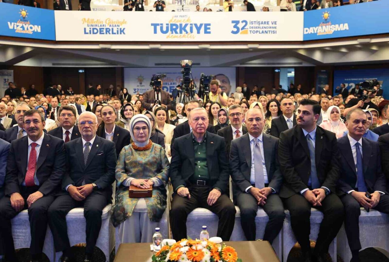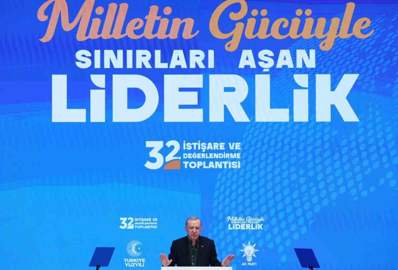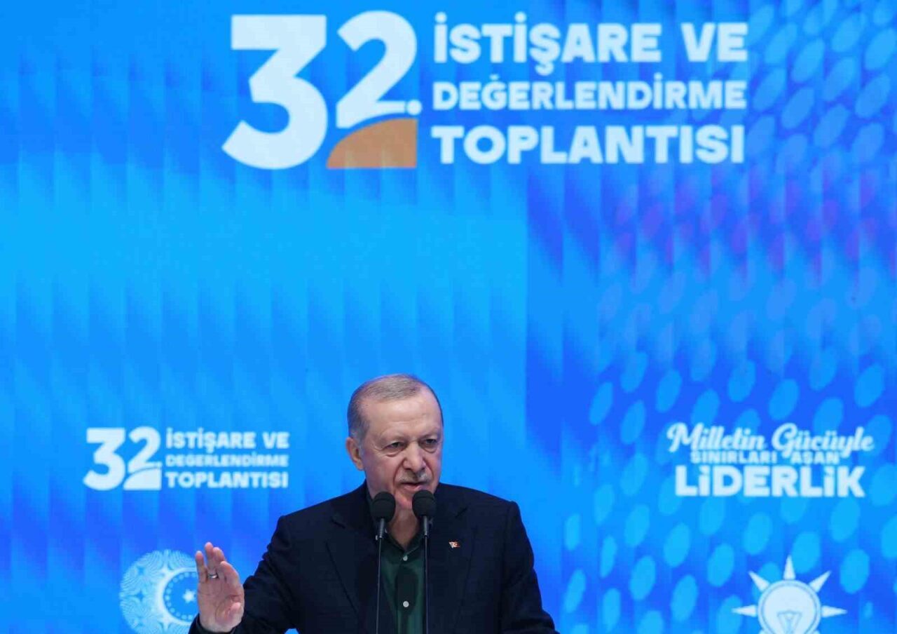 Konuşmasına toplantıya katılan Merkez Karar ve Yönetim Kurulu, diğer genel merkez kurulları, Kadın ve Gençlik Kolları üyeleri, milletvekilleri ve kabine üyelerini selamlayarak başlayan Cumhurbaşkanı Erdoğan, “AK Parti İstişare ve Değerlendirme toplantılarımızın 32’ncisinde sizlerle beraber olmaktan büyük bir memnuniyet duyuyorum. İstişare toplantımızın ülkemiz, milletimiz ve demokrasimiz için hayırlara vesile olmasını Cenabı Allah’tan niyaz ediyorum. Türkiye Yüzyılı’nı kutlu bir şafak bilen tüm kardeşlerimi, partimizin emektarlarını, kadın ve gençlik kollarımızı, genel merkezinden mahalle temsilcisine kadar her kademede fedakarca görev yapan tüm yol ve dava arkadaşlarımı buradan hürmetle selamlıyor, bu davaya gönül vermiş, bu dava için yüreğini ortaya koymuş her bir kardeşime şükranlarımı sunuyorum” “dedi
