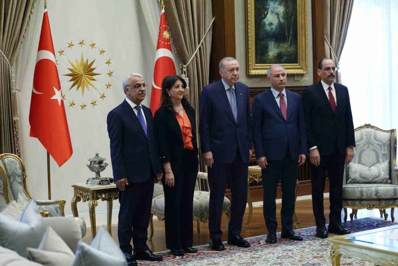 Cumhurbaşkanı Recep Tayyip Erdoğan, Halkların Eşitlik ve Demokrasi Partisi (DEM Parti) heyetinde yer alan TBMM Başkanvekili ve Van Milletvekili Pervin Buldan ile Şanlıurfa Milletvekili Mithat Sancar’ı Cumhurbaşkanlığı Külliyesinde kabul etti. Yaklaşık 1 saat süren kabulde, MİT Başkanı İbrahim Kalın ve AK Parti Genel Başkanvekili Efkan Ala yer aldı.