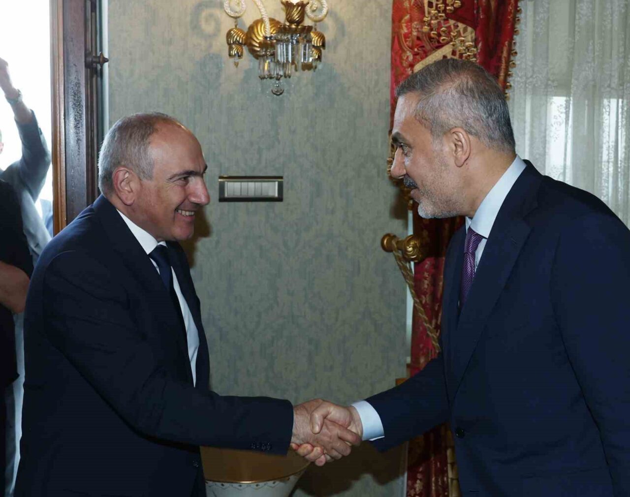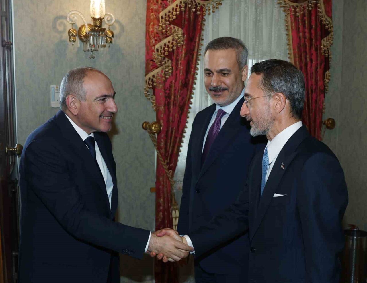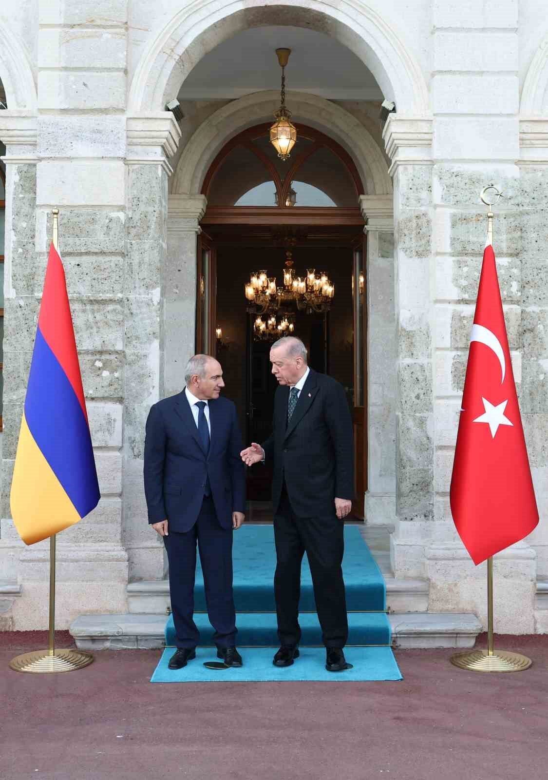 Cumhurbaşkanı Recep Tayyip Erdoğan, Ermenistan Başbakanı Paşinyan’ı Beşiktaş’taki Cumhurbaşkanlığı Dolmabahçe Çalışma Ofisi’nde resmi törenle karşıladı. Tören sonrası Cumhurbaşkanı Erdoğan ile Paşinyan birbirlerine heyetlerini takdim ederek görüşmeye geçti.