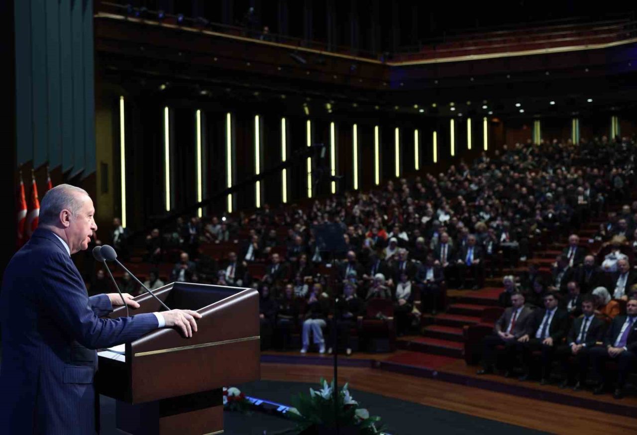Cumhurbaşkanı Erdoğan, küresel kültür savaşlarında güçlü bir duruş için yerli ve milli kültür değerlerinin evrensel bir bakış açısıyla ele alınması gerektiğine dikkat çekerek, “Yerli ve milli olan kültür değerlerimizi evrensel bir perspektifle harmanlamalı, yeniden üretmeli ve yeniden inşa etmeliyiz” diye konuştu.
