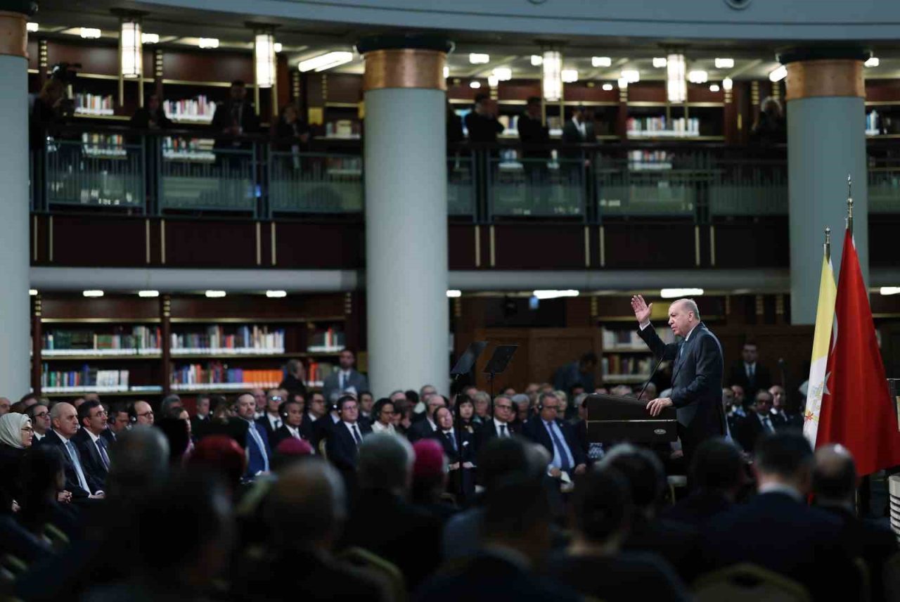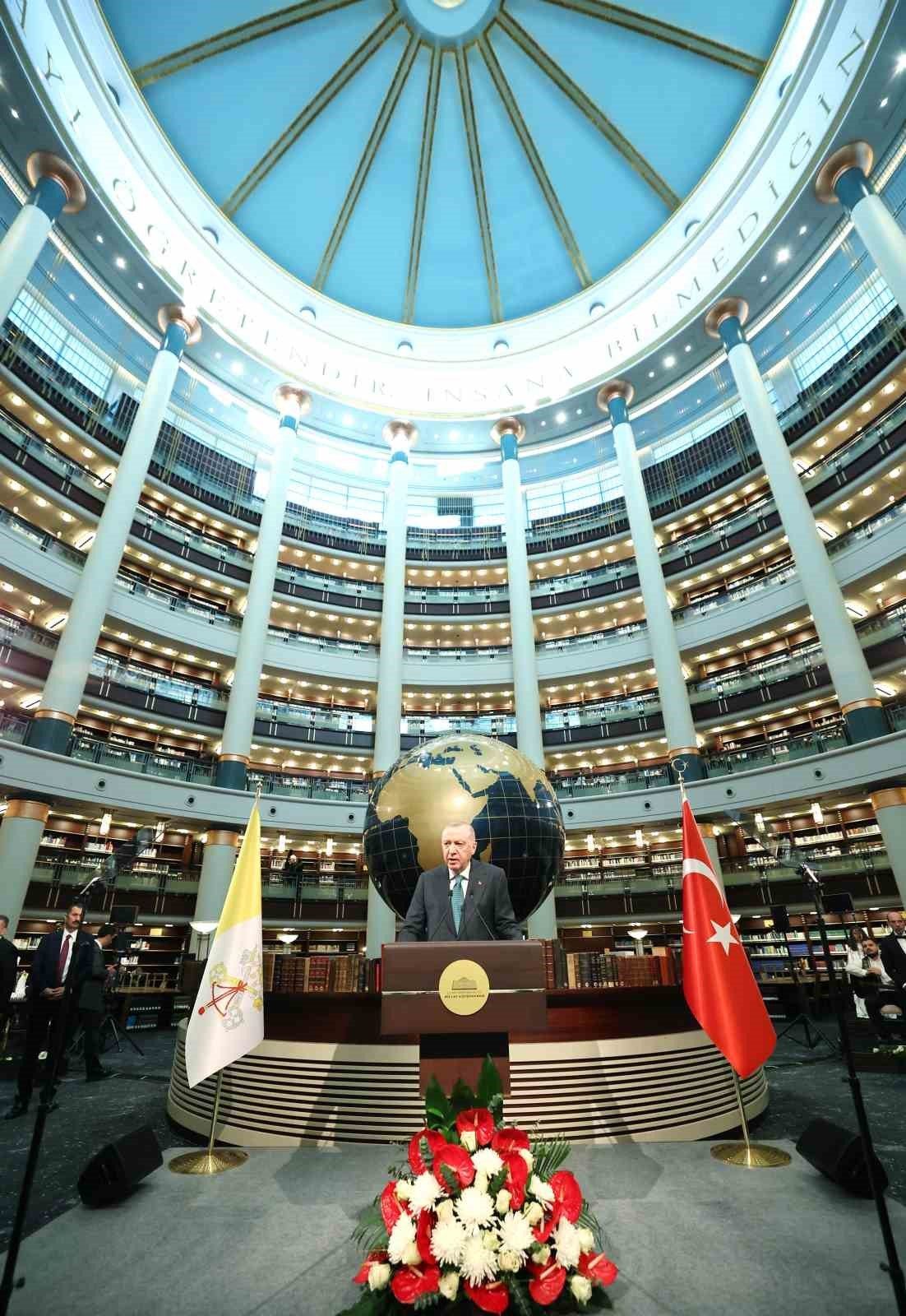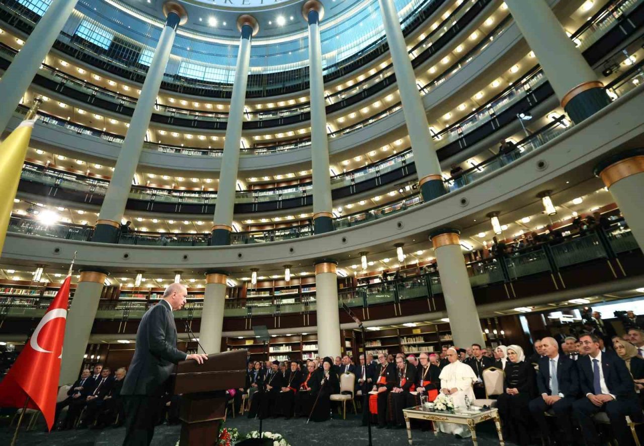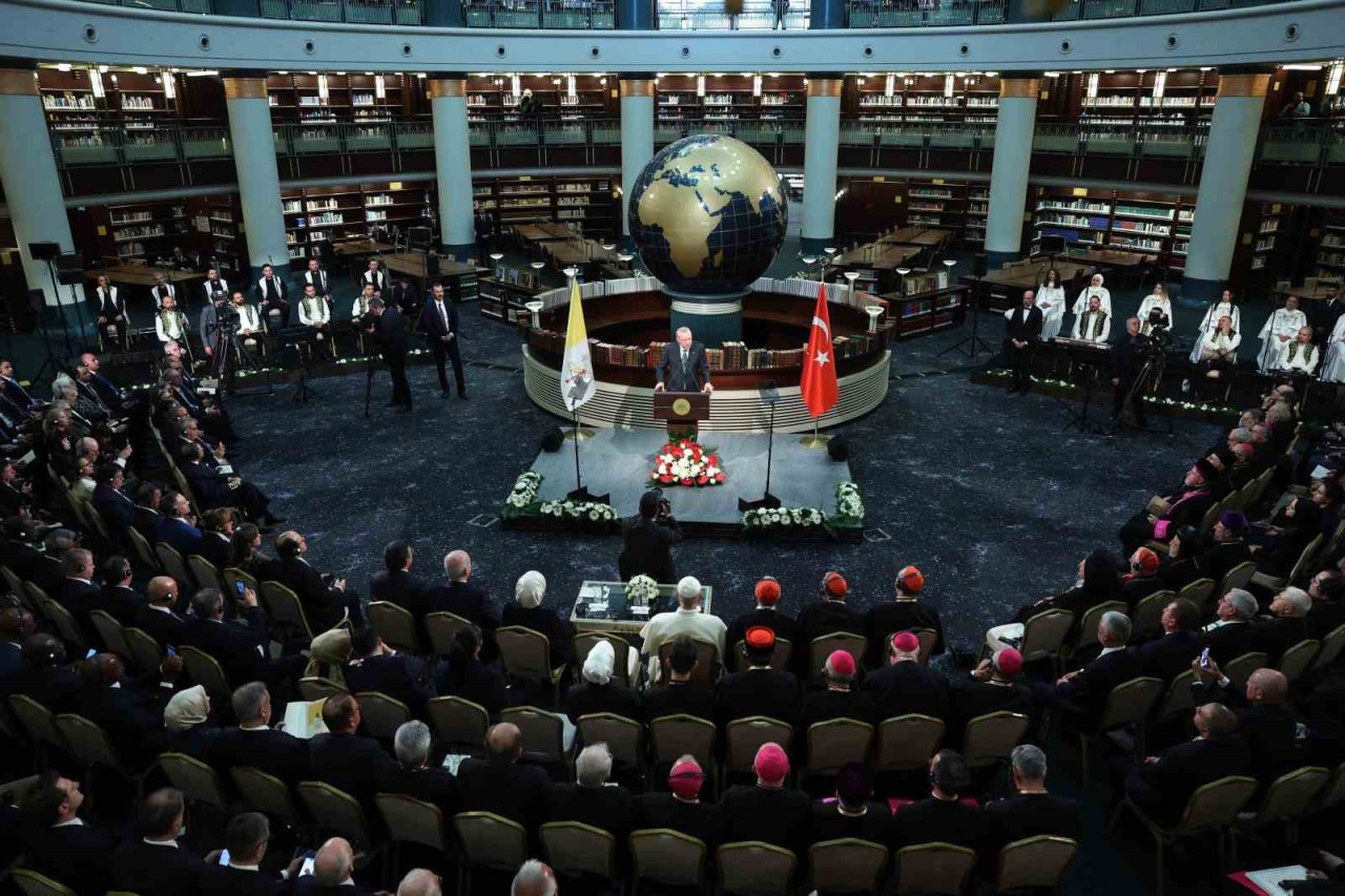 Cumhurbaşkanı Recep Tayyip Erdoğan, Vatikan Devlet Başkanı Papa 14. Leo Cumhurbaşkanlığı Millet Kütüphanesi Cihannüma Salonun’da Davetlilere hitap etti.