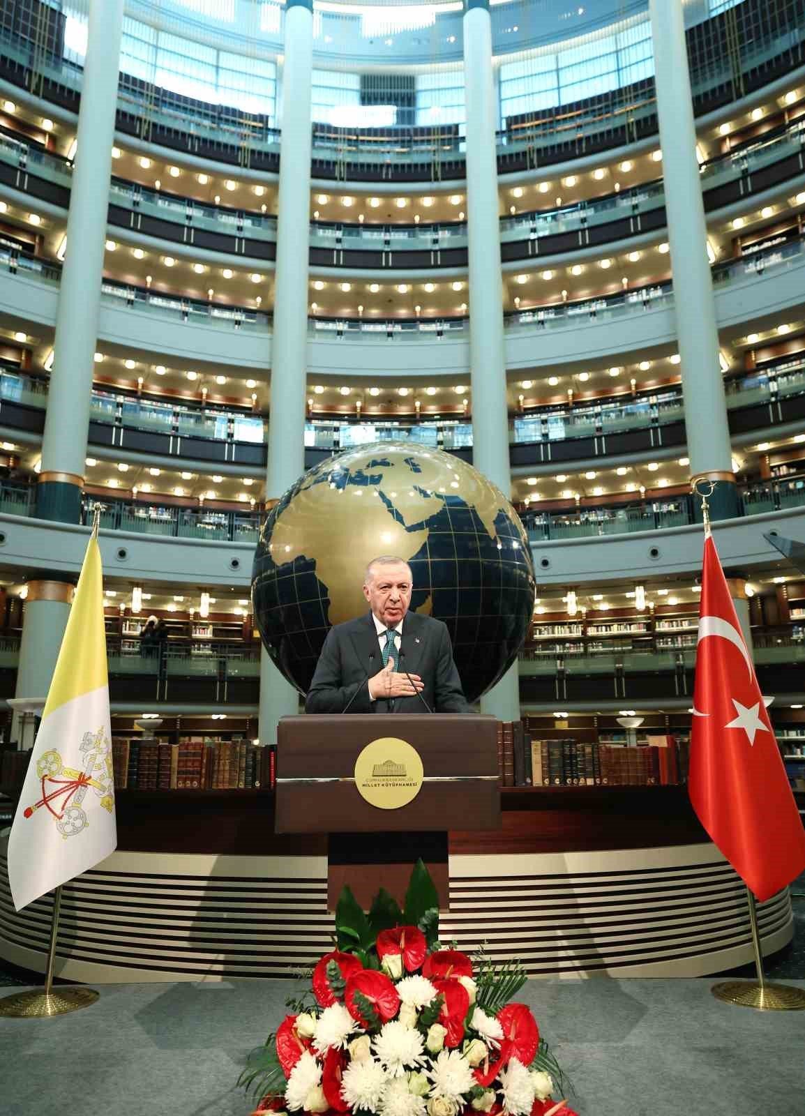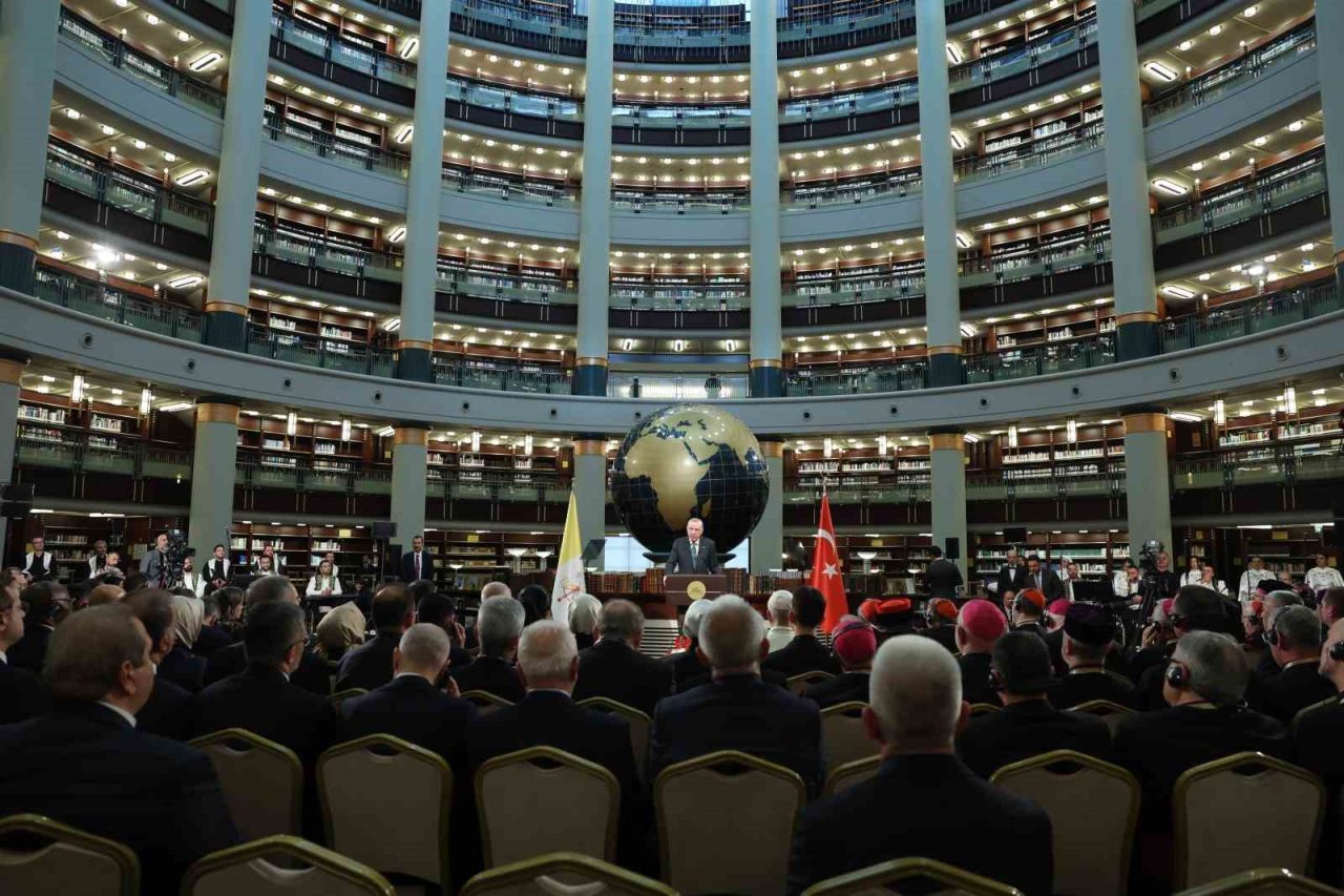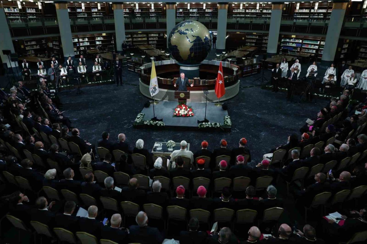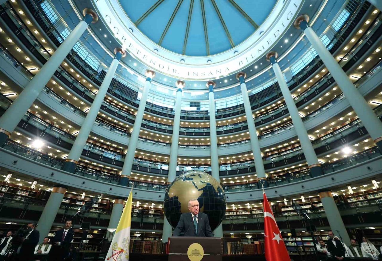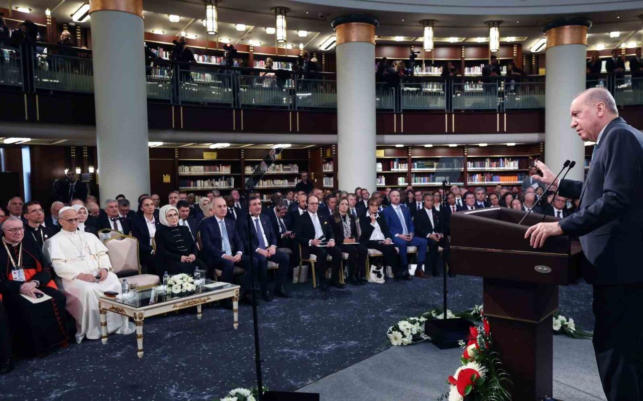Cumhurbaşkanı Recep Tayyip Erdoğan, Vatikan Devlet Başkanı Papa 14. Leo Cumhurbaşkanlığı Millet Kütüphanesi Cihannüma Salonun’da Davetlilere hitap etti.