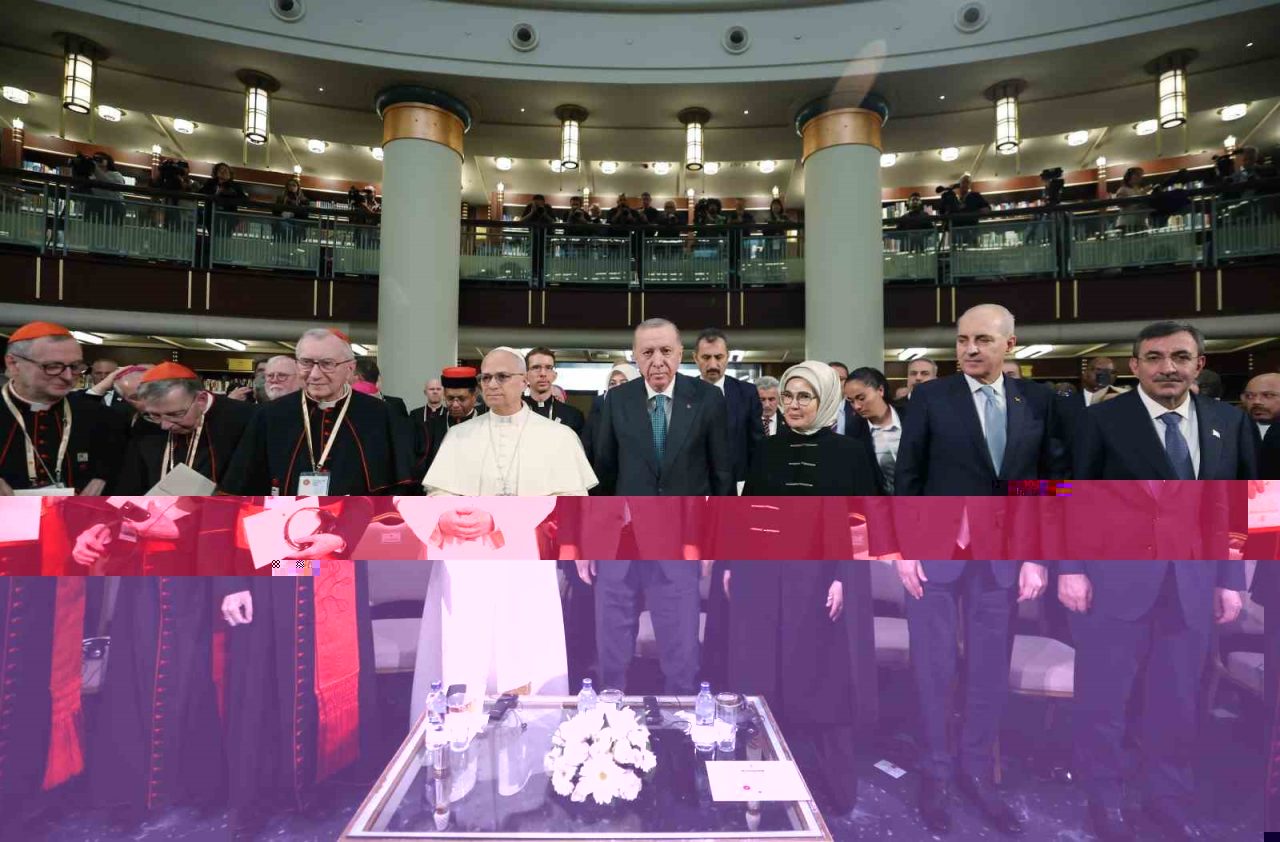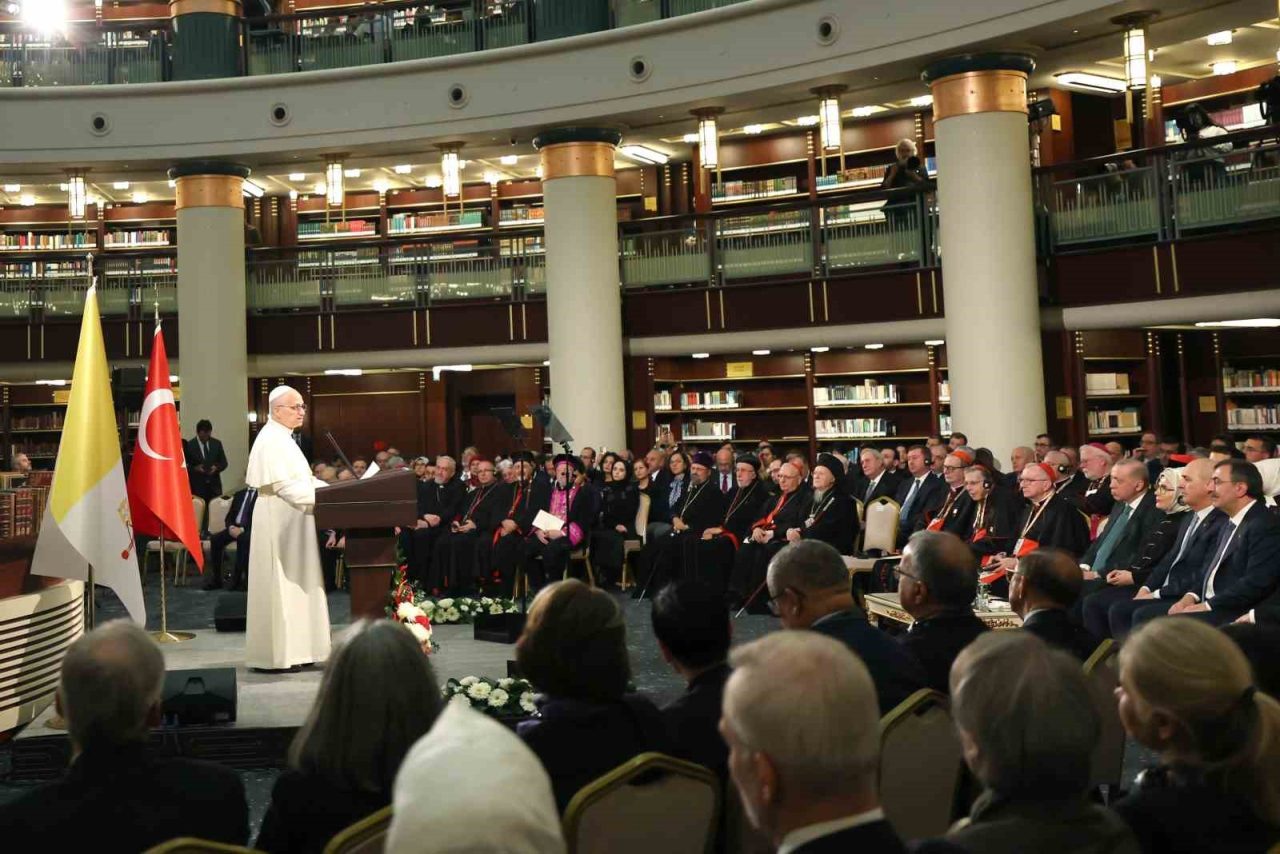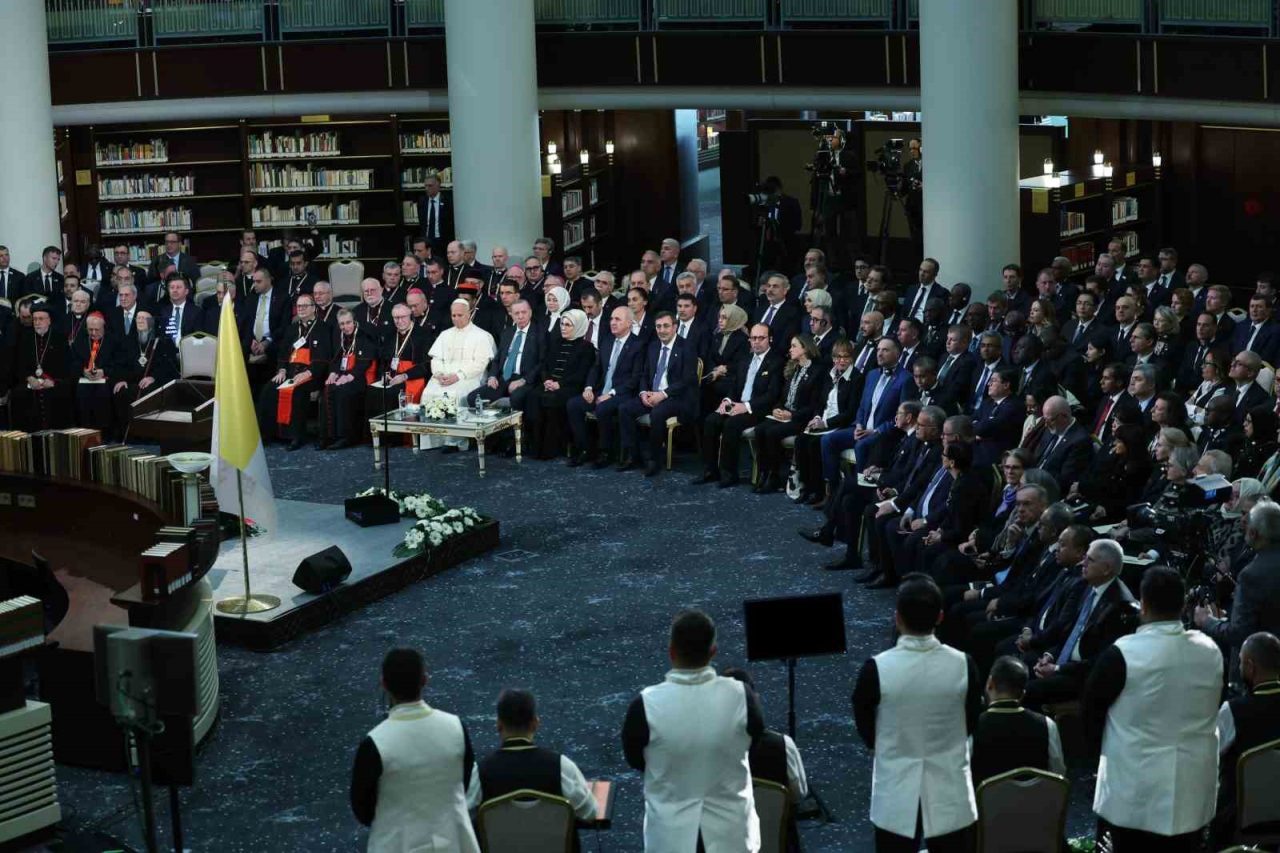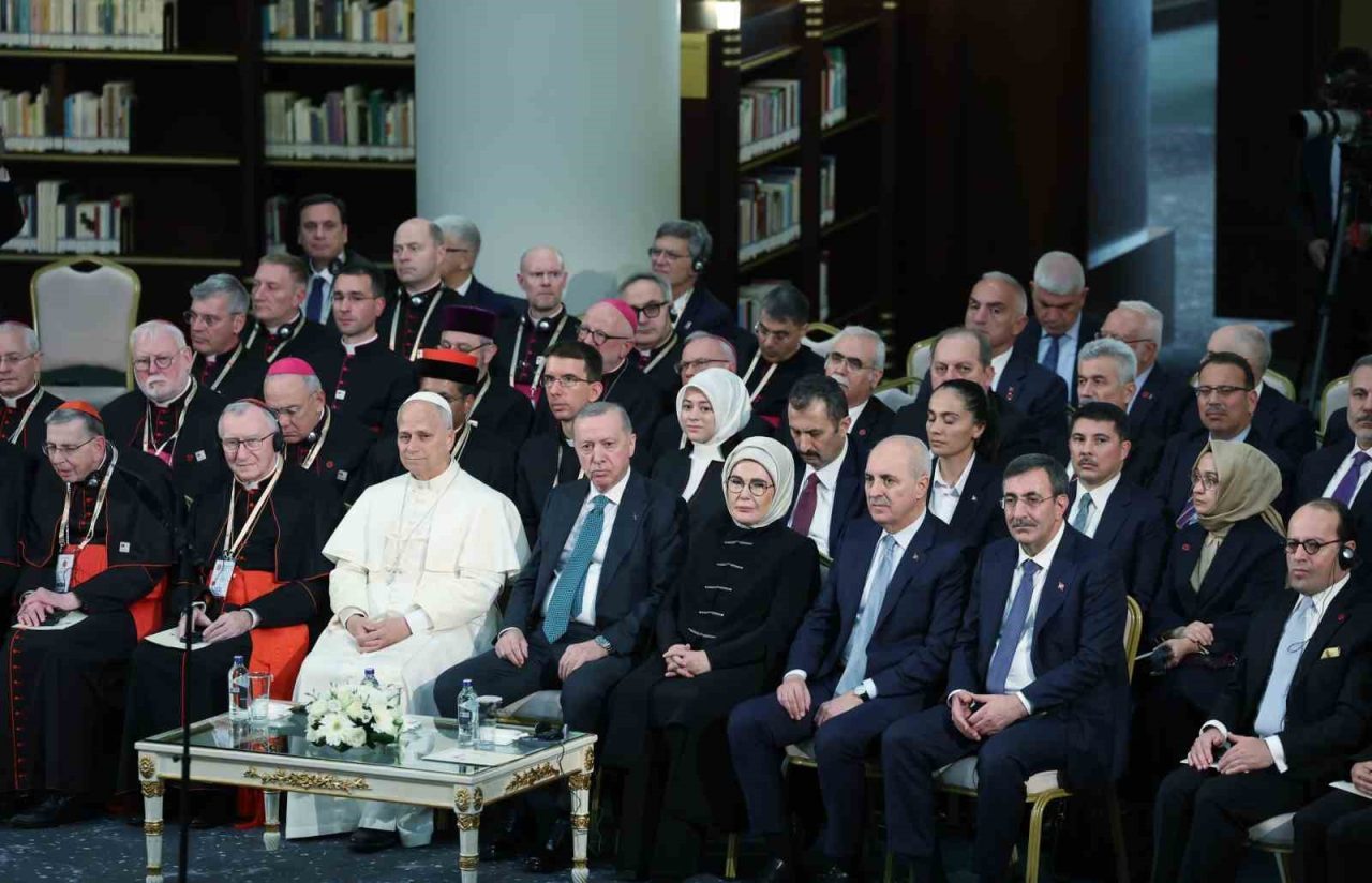 Papa 14. Leo’yu ve heyetini Türkiye’de misafir etmekten büyük bir memnuniyet duyduğunu belirten Cumhurbaşkanı Erdoğan,” Katolik dünyasının ruhani lideri, Vatikan Devlet Başkanı Papa 14. Leo, ülkemizdeki diplomatik misyonların değerli temsilcileri, çok kıymetli misafirler, hanımefendiler, beyefendiler; sizleri şahsım, ülkem ve milletim adına en kalbi duygularımla, hürmetle selamlıyorum. Bir kez de sizlerin huzurunda kıymetli misafirimiz ve heyetine ülkemize hoş geldiniz diyorum” dedi.