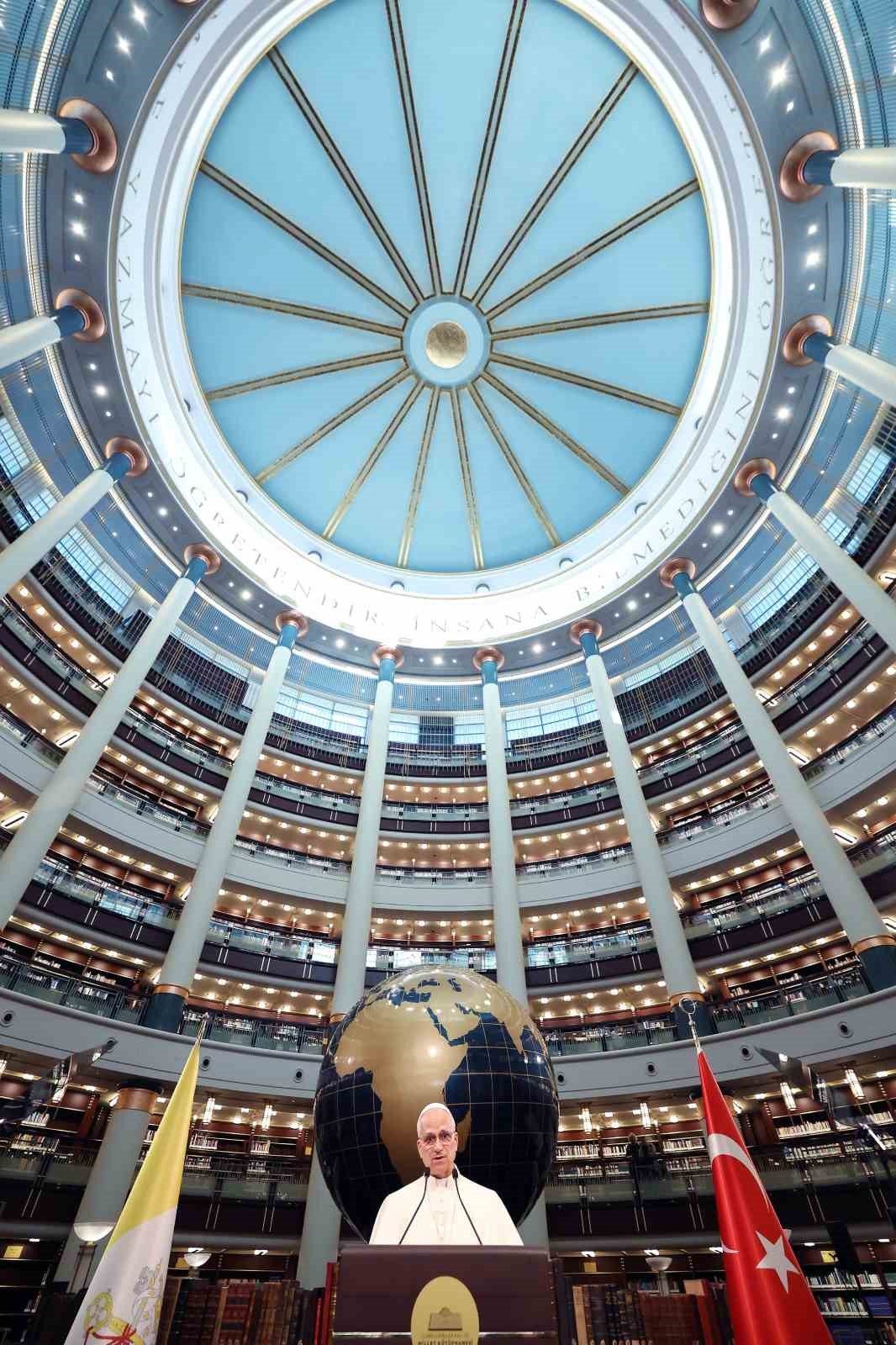 CUMHURBAŞKANI RECEP TAYYİP ERDOĞAN, VATİKAN DEVLET BAŞKANI PAPA 14. LEO CUMHURBAŞKANLIĞI MİLLET KÜTÜPHANESİ CİHANNÜMA SALONUN’DA DAVETLİLERE HİTAP ETTİ.