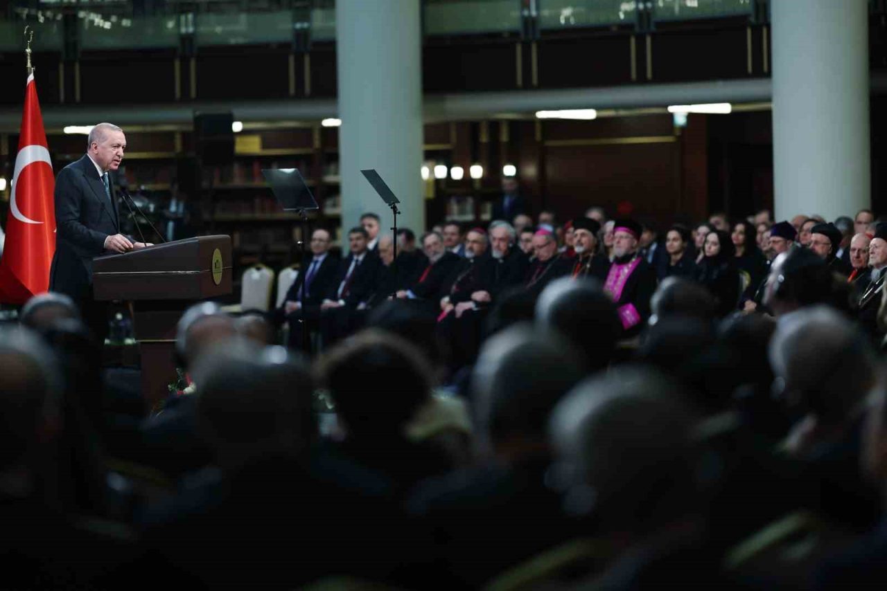 Cumhurbaşkanı Erdoğan,” Biz her fırsatta vurguladığım gibi ilhamını çift başlı Selçuklu kartalından alan, yüzü ve yönü hem doğuya hem batıya dönük bir ülkeyiz. Bin yıldır vatanımız olan bu topraklarda her ırka, dine, mezhebe, kökene mensup insanlar hiçbir endişe, hiçbir baskı olmadan özgürce yaşamıştır. İstanbul’a, Hatay’a, Mardin’e, Diyarbakır’a, birçok şehrimize gittiğinizde camilerle birlikte kilise ve sinagogları yan yana görürsünüz. İstanbul’da Aya İrini Müzesi ve Neve Şalom Sinagogu, Trabzon’da Sümela Manastırı, Van’da Akdamar Müzesi ve daha nicesi İşte bu ortak yaşam kültürümüzün tanıklarından sadece birkaçı. Göreve geldiğimiz 2002 yılından bu yana 100’e yakın kilise, manastır ve ibadethanenin restorasyonunu tamamladık. Bunların bir kısmının açılışına bizzat iştirak ettim. Yıl sonuna kadar beş eseri daha ibadete açmayı hedefliyoruz” açıklamasını yaptı.