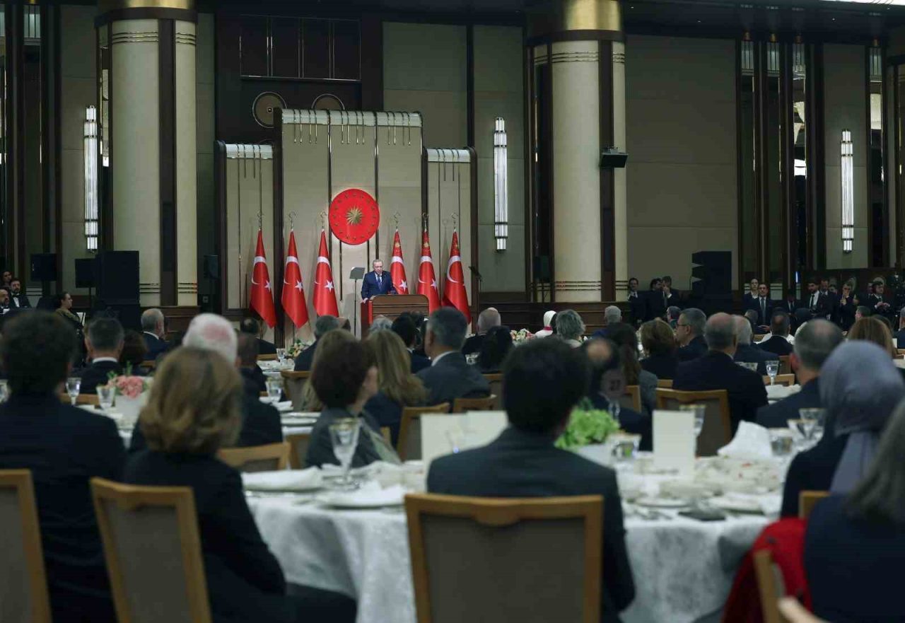 Hariciye Teşkilatı’nın mesuliyetlerini hakkıyla yerine getirebilmesi için eylül ayında yeni yerleşkesinin temellerini attıklarını kaydeden Erdoğan, “Dışişleri Bakanlığımızın yeni binasının, devletimizin köklü diplomasi geleneğini, gelecek vizyonunu ve milletimizin güçlü iradesini yansıtacak bir eser olacağına yürekten inanıyorum. Elbette bunları sizlerden beklerken biz de boş durmuyor, Türkiye’yi en güzel yerlere taşımak için gece gündüz demeden çalışıyoruz” şeklinde konuştu.