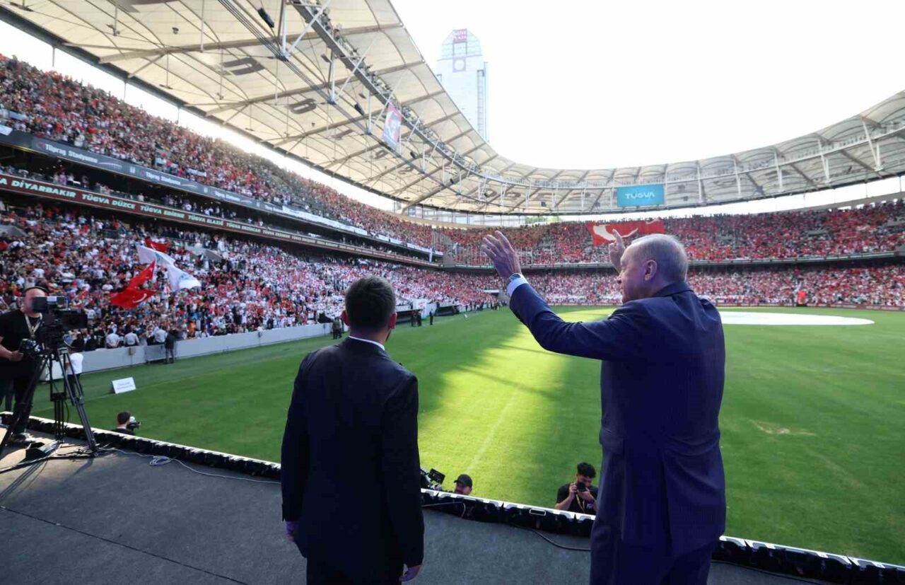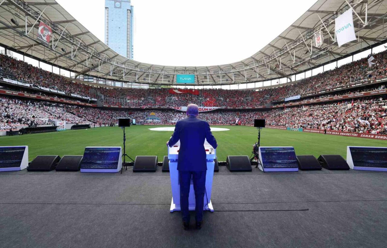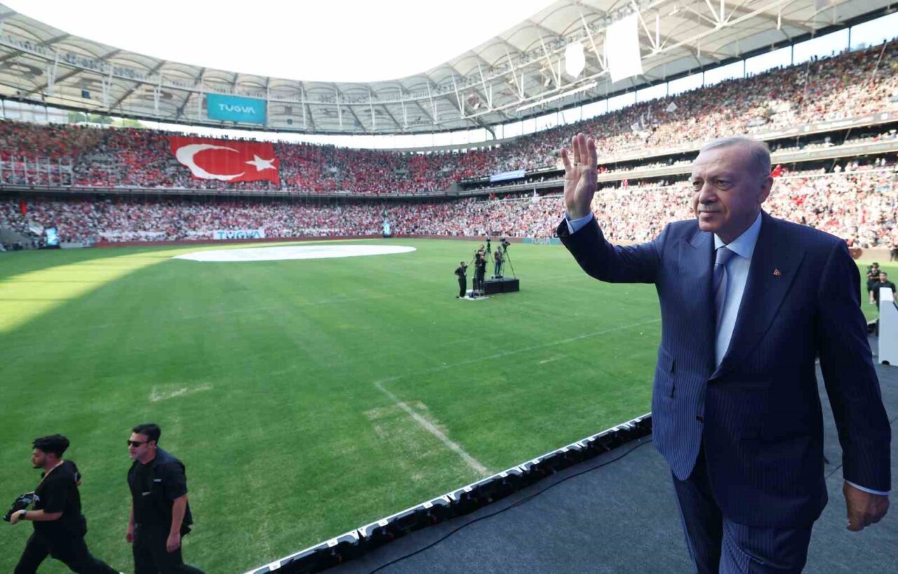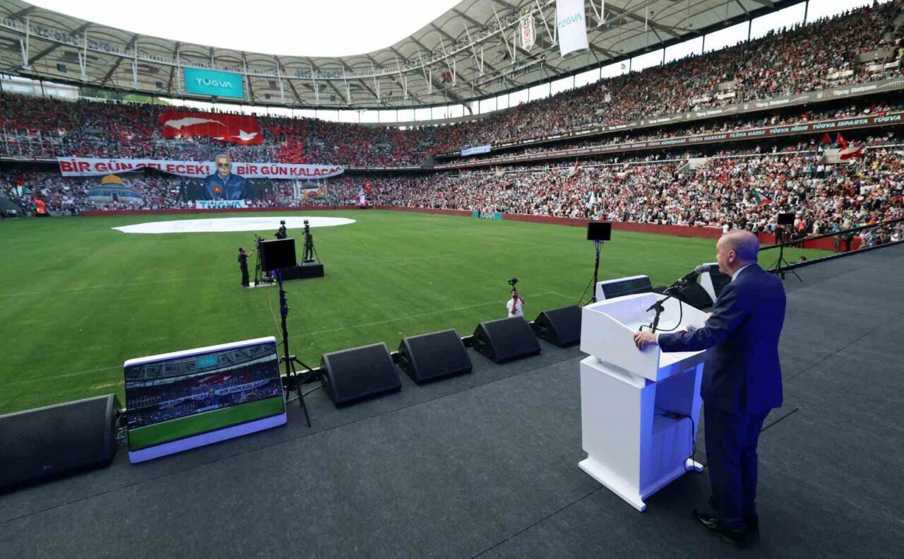 Erdoğan, “Milletimizin hasretini çektiği büyük ve güçlü Türkiye’ye kavuşmamıza çok az kaldı. Zulümle, krizle, çatışmayla boğuşan coğrafyamızda barış rüzgarlarının esmesine inanın çok az kaldı. Allah’ın izniyle sizlere terörün olmadığı her metrekaresinde huzurun, güvenliğin, refahın, kardeşliğine kemer olduğu bir Türkiye’yi teslim edeceğiz. Son nefesimize kadar sizlerin hizmetinde olmaya inşallah devam edeceğiz” şeklinde konuştu.