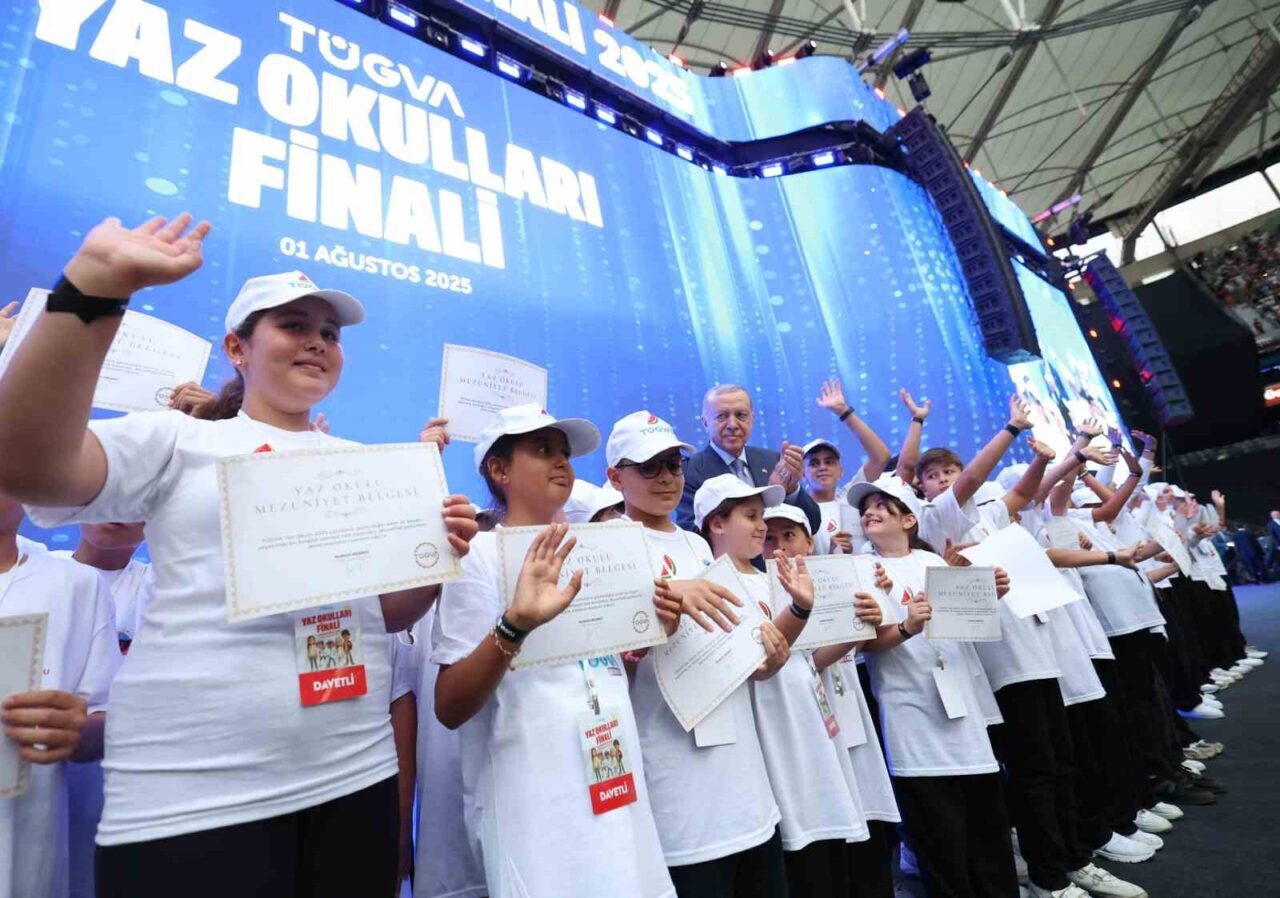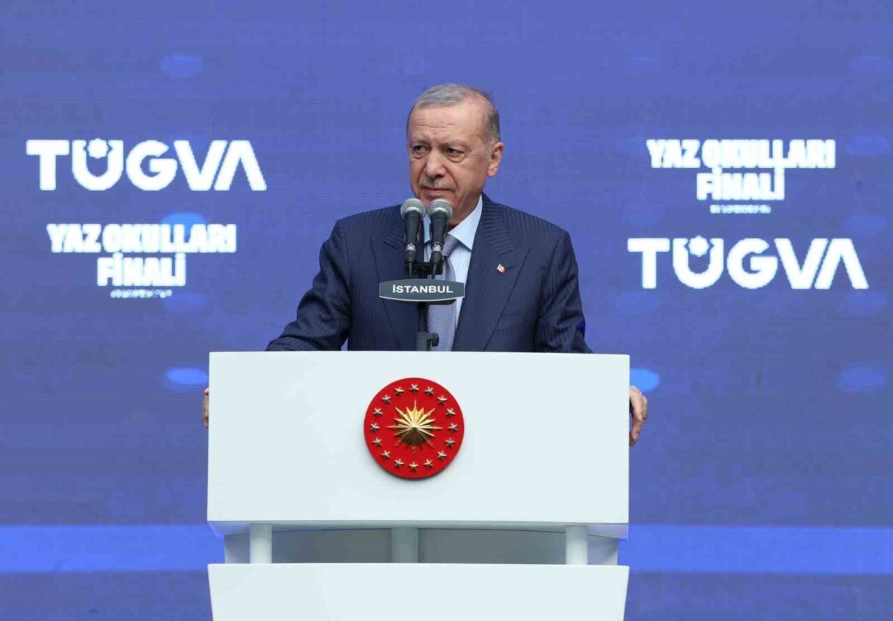 Cumhurbaşkanı Recep Tayyip Erdoğan, Beşiktaş Tüpraş Stadyumu’nda gerçekleştirilen Türkiye Gençlik Vakfı (TÜGVA) Yaz Okulları Finali Programı’na katıldı. Gençleri selamlayarak konuşmasına başlayan Erdoğan, TÜGVA mensuplarına teşekkür ederek, “Kalbi güzel, zihni açık, heyecanı yüksek evlatlarımızla buluştuğumuz bu programda emeği geçen her bir kardeşime şükranlarımı iletiyorum. Sevgili gençler, 81 ilimizde 400 bin öğrencinin katıldığı yaz okullarında gençlerimiz 6 hafta boyunca dolu dolu zaman geçirdiler. Bir yandan milli ve manevi değerlerimizi kuşanırken, diğer yandan farklı spor dallarında kendilerini geliştirdiler. Türkiye Gençlik Vakfımız maşallah hem eğitim, hem kültür, sanat ve spor faaliyetleriyle 11 yıldır çok kıymetli hizmetler veriyor. Vakıf okulları, doğa kampları, münazara yarışmaları, kitap okuma kulüpleri gibi programlarla milyonlarca gencimize ulaşıyor. İslam dünyasını ilgilendiren bütün meselelerde TÜGVA milletimize yakışan vicdanlı, onurlu, merhametli bir duruş sergiliyor. Vakfımızın daha pek çok alandaki başarılı çalışmalarıyla iftihar ediyoruz” diye belirtti.