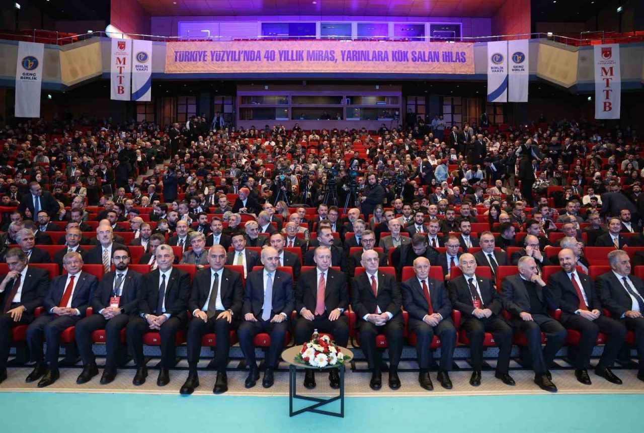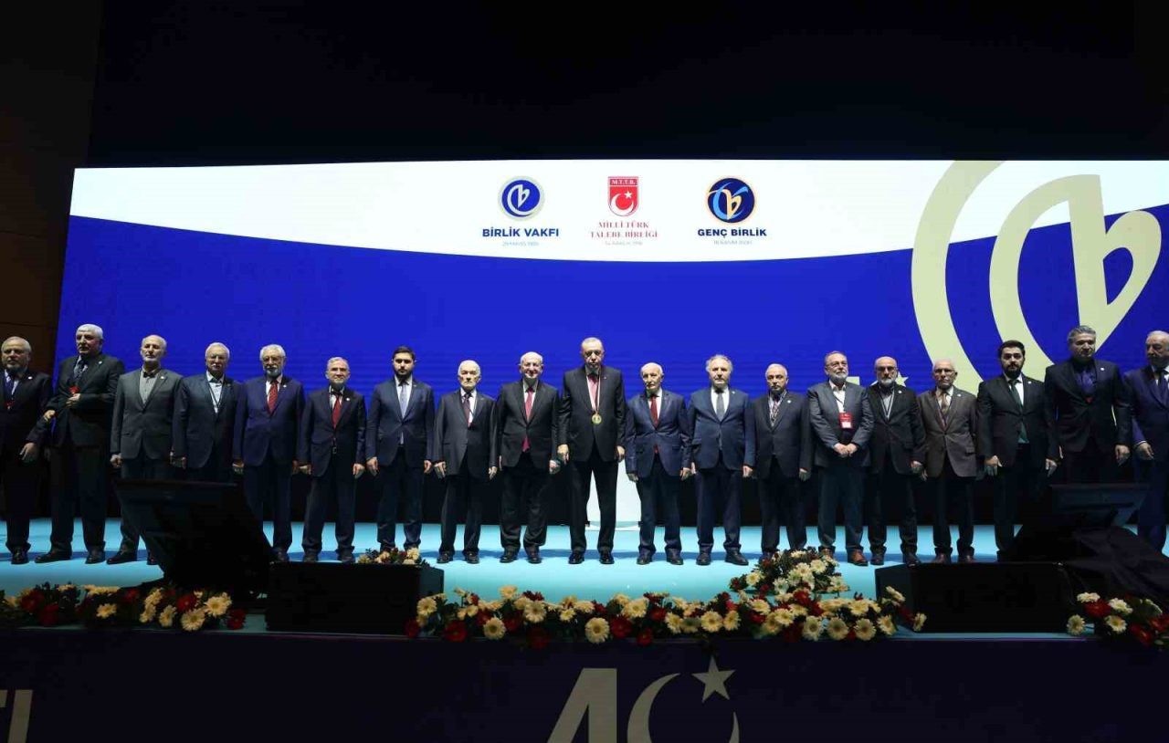 Cumhurbaşkanı Erdoğan, “40 yılda kat edilen bu önemli mesafenin her aşamasında talebeler için yemek pişiren, misafirlere çay ikram eden, yurtların bakım ve temizliğini üstlenen emekçi kardeşlerimizden gençlere danışmanlık yapan, öğrencilere burs bağlayan, tecrübeleriyle birlikte tavsiyelerini de gençlerle paylaşan hayırsever insanlara kadar yöneticisinden personeline, kurucusundan mütevelli üyesine vakfımızın her bir mensubunun payı vardır, emeği vardır, göz nuru, gönül harcı vardır. Bunun için hepinize ayrı ayrı teşekkür ediyorum. Bu çatı altında ter döken, halka hizmet, Hakka hizmettir düsturuyla geceyi gündüze katan, ailesinden fedakarlıkta bulunarak burada Allah rızası için koşturan her bir kardeşime şükranlarımı ifade ediyorum. Burası görüldüğü gibi böyle bir salon değildi. Burası belediye başkanlığım döneminde Spor Sergi Sarayı’ydı. Ve biz üstat ile burada nice konferansları yaptık. Ve Demirel’in de cumhurbaşkanlığı döneminde burayı yıkıp bu hale getirdik. Ve o konferanslarda öyle zannederdi ki yıkıldı yıkılacak, Spor Sergi Sarayı’nın öyle bir hali vardı. Ama gel gör ki hamdolsun böyle bir salonu İstanbul’umuza kazandırdık. İnşallah daha nice yıllar boyunca Birlik Vakfımızın ülkemize, milletimize, gençlerimize ve ümmete özveriyle hizmet edeceğine yürekten inanıyorum.Tabii şu gerçek de hafızalarımıza silinmez bir şekilde kaydolmuştur. 1916 yılında kurulan Milli Türk Talebe Birliği Türkiye’nin en köklü öğrenci teşkilatı olarak dalları vatanımızın dört bir yanına uzanan binlerce talebeyi gölgesinde serinleten büyük bir çınardı. Milli Türk Talebe Birliği, Türkiye’nin sancılı günlerinde şahsım dahil birçok gencin milli şuur kazanmasına, dahası bu ülkeyi, bu milleti, bu toprakları anlamasına, idrak etmesine vesile oldu. Gençlik yıllarımda aktif görev üstlendiğim Milli Türk Talebe Birliği’nde kendilerine ağabey diye hitap ettiğim, her birinden çok şey öğrendiğim nice büyüğümüz, nice ilim, kültür ve aksiyon adamımız, nice mütefekkirimiz vardı. Milli Türk Talebe Birliği bizim için bir okuldu. Kere ağlarını gönül ve zihin dünyamıza aydınlatan bir irfan ocağıydı. Ancak 1980 darbesinin üzerinden silindir gibi geçtiği sivil teşekküllerden biri de unutmayalım Milli Türk Talebe Birliği’ydi. Hani diyor ya Karacaoğlan: “Aradılar bir tenhada buldular, yaslandılar şıvgaların kırdılar, yaz bahar ayında bir od verdiler, yandım gittim alakarlı dağlar iken.” İşte darbeciler de tamamen keyfi sebeplerle, sırf millete düşmanlıklarından dolayı Milli Türk Talebe Birliği’nin kapısına kilit vurdular. Bu ocağı bitirmek istediler. Ama her Milli Türk Talebe Birliği’nin yüreğinde kor bir ateş misali yanan o ruhu, kanında dolaşan o dava şuurunu söndüremediler. Üstadın ifadesiyle; kökü ezelde ve dalı ebette bir sistemin aşkına, vecdine, diyalektiğine, estetiğine, irfanına, idrakine sahip bir gençliğin önüne set çekemediler. Milli Türk Talebe Birliği’ne zorla bıraktırılan sancağı Birlik Vakfımız devralmış, millete ve ümmete hizmet mücadelesi kesintiye uğramamış, uğratılamamıştır. Milli Türk Talebe Birliği’nin özünü oluşturan, varoluş gayesini teşkil eden tüm değerler, Birlik Vakfında yeniden temerküz ve tecessüm etmiştir. Bir kapı kapanmış fakat Cenab-ı Allah’ın sonsuz lütfuyla çok daha geniş, çok daha güçlü yeni bir kapı açılmıştır. 1985’te kutlu fethin yıl dönümünde kurulan Birlik Vakfı, teessüs ettiği günden itibaren daima milletin ve milli iradenin safında yer almıştır. 28 Şubat’ın yasakçı zihniyetinden vesayet odaklarıyla mücadeleye, Gezi olaylarından 15 Temmuz kanlı ihanetine, en kritik dönemeçlerde ateşten gömlek giydiğimiz tüm imtihan günlerinde Birlik Vakfını hep milletin yanında, Hakk’ın ve hakikatin cephesinde gördük. Bunun için de her birinize ayrı ayrı teşekkür ediyor, Rabbim sizlerden razı olsun diyorum ” ifadelerini kullandı.