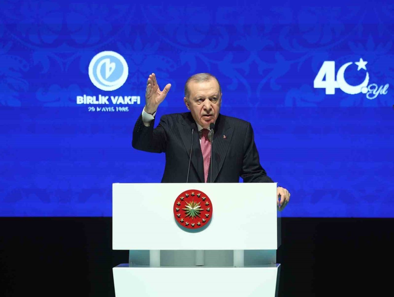 Muhterem başkanlarımız Yaşar Karayel ve Mehmet Alacacı’nın şahsında, vakfımızın kurucular kuruluna, mütevelli heyetine yine burada başarı dileklerimi ileten Cumhurbaşkanı Erdoğan, “Teşekkür ediyorum. Rabbim emeklerinizi zayi etmesin. Çabalarınızı, gayretlerinizi, döktüğünüz şu alın ve fikir terini inşallah hayra tebdil eylesin diyorum. Arkadaşlarım, bir defa şunu büyük bir bahtiyarlıkla ifade etmek istiyorum. Şahsımın da kurucuları arasında yer aldığı Birlik Vakfı özellikle eğitim ve kültür alanında 40 yıldır mühim bir misyonu, hamdolsun, başarıyla yerine getiriyor. 50 ilimizdeki 55 şubesiyle, barınma hizmetlerinden burs desteklerine, bilim, kültür ve sanat faaliyetlerinden yabancı dil kurslarına, oldukça geniş bir yelpazede gençlerimizin elinden tutuyor, onları yarınlara hazırlıyor, istikbalimizin güvencesi olan genç arkadaşlarımıza rehberlik ediyor. Konferanslarıyla, panelleriyle, matbu ve dijital yayın faaliyetleriyle, farklı ihtisas alanlarındaki yirmiyi aşkın komisyonuyla Birlik Vakfımız ilim, kültür ve irfan hazinemizi maziden atiye ulaştırıyor. Buradaki arkadaşlarımız milli ve manevi değerlerine sıkı sıkıya sarılan, bilgisiyle, eğitimiyle, ufku ve karakteriyle karanlıklar içinde ışıl ışıl parlayan bir gençliğin yetişmesi için 40 yıldır elinden geleni yapıyor. Vakfımızın niyeti hayır olduğu için hamdolsun, cehdi de emeği de gayreti de hayırlı neticelerle taçlanıyor. Merkezinde birlik anlayışının yer aldığı bu ocaktan yetişen kardeşlerimiz bugün siyasetten iş hayatına, akademiden bürokrasiye, her alanda Türkiye’ye alınlarının akıyla hizmet ediyor. Tüm zorluklara, tüm sıkıntılara rağmen 29 Mayıs 1985’ten beri tekerleğin tümsekte kalmasını bekleyenlere rağmen bütün bu hizmetleri yaptık, yapıyoruz, Rabbim ömür verdikçe de yapmaya devam edeceğiz” şeklinde konuştu.