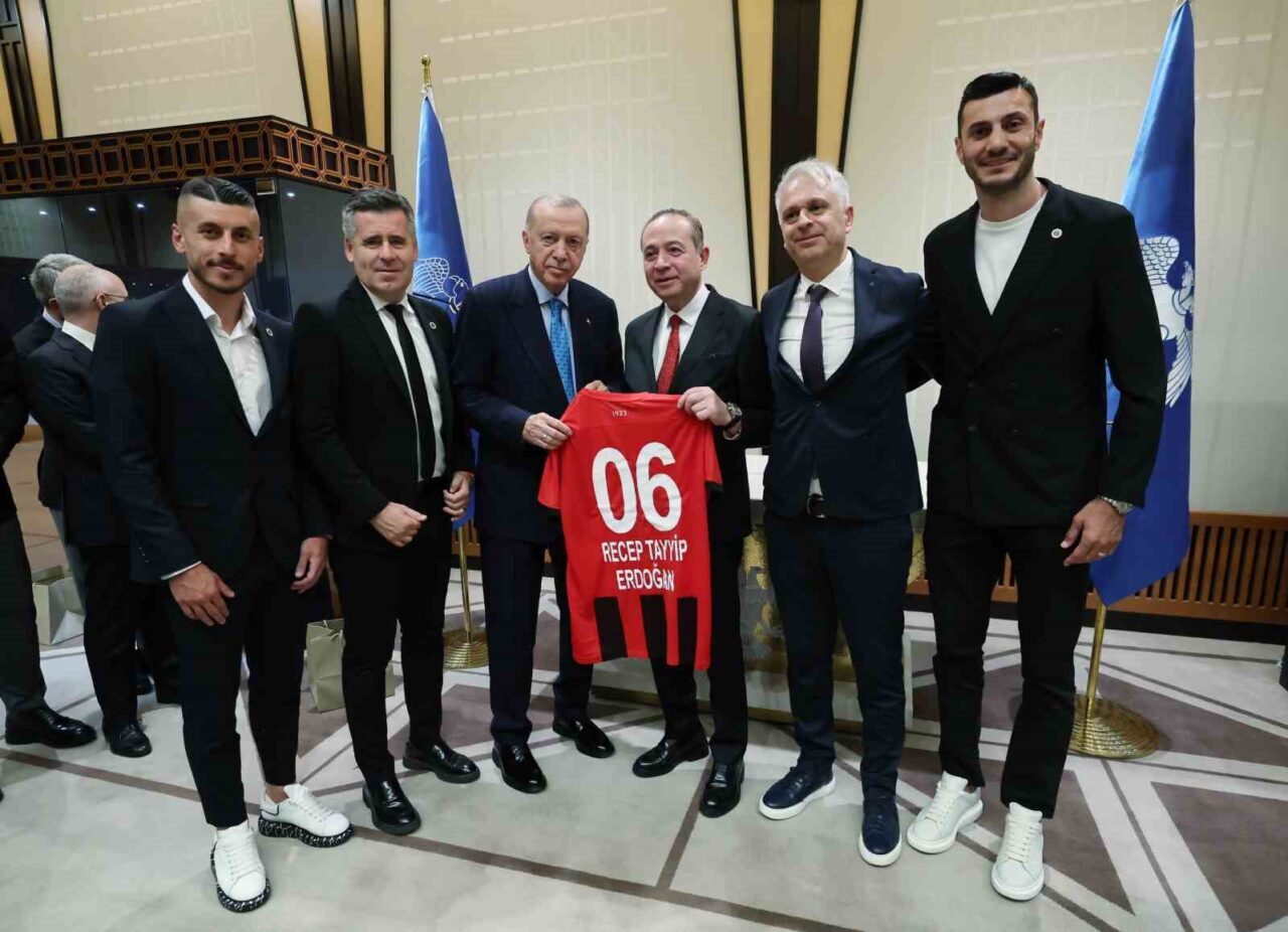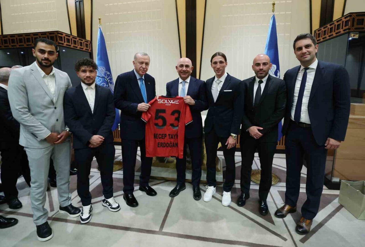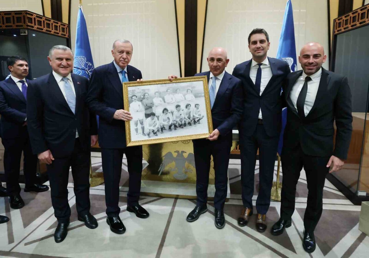 Takım başkanları tarafından Cumhurbaşkanı Erdoğan’a forma ve futbol oynadığı döneme ait fotoğrafın hediye edildiği kabulde, hatıra fotoğrafı çektirildi.