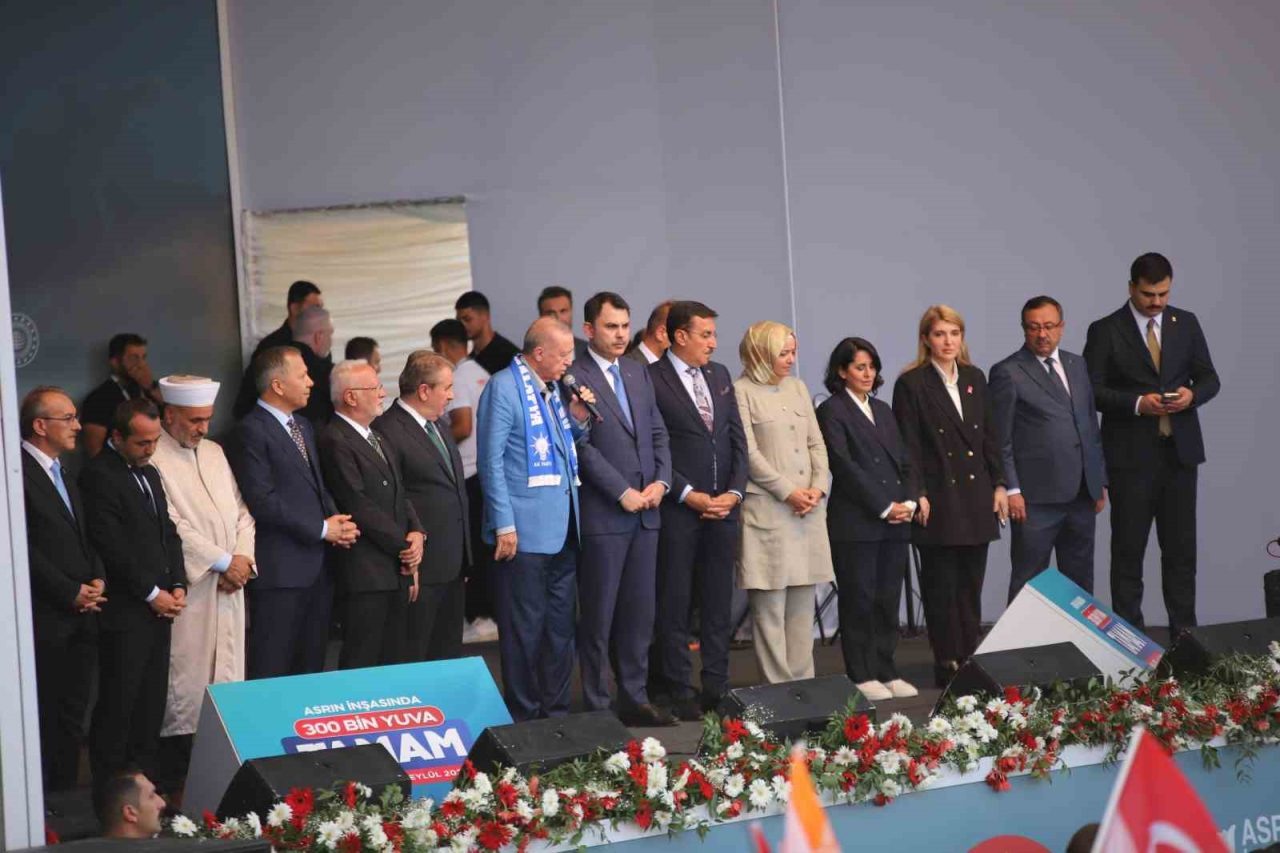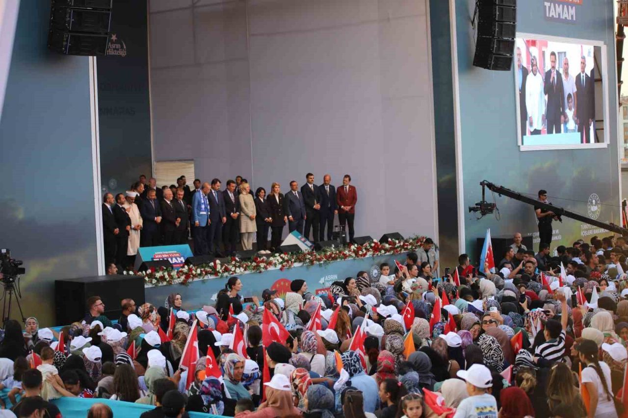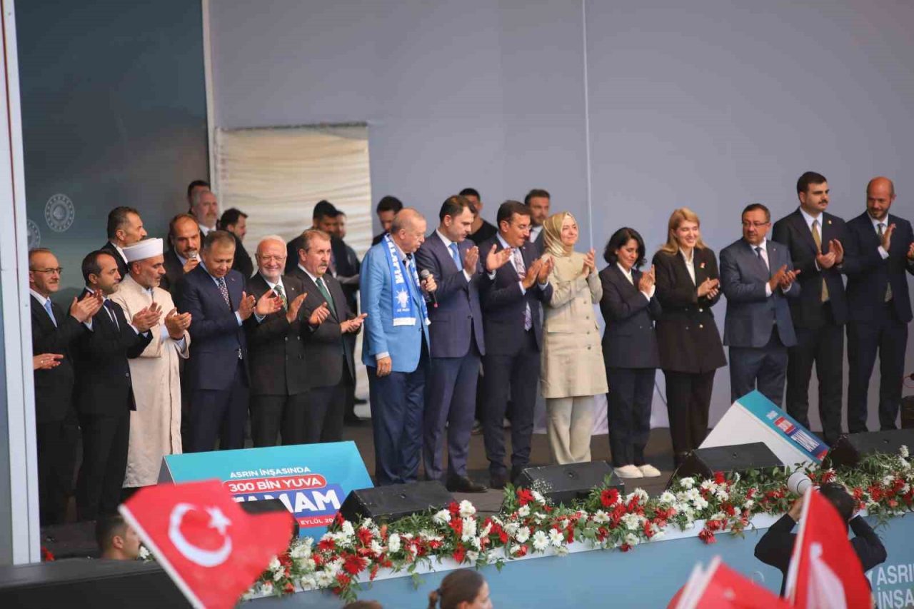 Cumhurbaşkanı Erdoğan, törende yaptığı konuşmada, “Malatya’mızın 13 ilçesinde 719 mahallesindeki her bir kardeşime selam ve sevgilerimi gönderiyorum. Deprem bölgesinde bugün 300 bininci konutumuzun dağıtımını yapıyoruz. Bugün yeni yatırımlarımızın resmi açılışını yapmanın gururunu yaşıyoruz. Hayırlı olmasını diliyorum. Bu konutlarda emeği geçen her bir kardeşime teşekkür ediyorum. Bugün Malatya’dayız. Malatya halkına ayrı ayrı teşekkür ediyorum. Malatya hem Türkiye’nin hem bölgesinin en gözde merkezlerinden biridir. Ülkemize önemli katkılar yapan bu şehirle gurur duyuyoruz. Malatya’yı asla ihmal etmedik. Malatya halkına aşkla hizmet ettik. Bundan sonrada aynı aşkla sizler için çalışmaya devam edeceğiz. 6 Şubat depremlerinden en çok etkilenen Malatya’ydı. 11 ilimizde 53 bin 737 canımızı kara toprağa verdik. Deprem şehitlerimize Allah’tan rahmet diliyorum. Bu meydana gelen kardeşimin sayısı 52 bindir. Depremden sonra geride kalan kardeşlerime sabır diliyorum. Allah bu acıyı bir kez daha yaşatmasın. 6 Şubat acısı bizim derdimiz oldu. Ama bu dert bize dayanışmayı bir ve beraberliği yeniden başlamayı öğretti. Biz de o gece hemen harekete geçtik. 7/24 çalıştık devletin tüm kurumlarıyla beraber. Kısa sürede enkazları kaldırdık, yaraları sardık. Yapılanı edileni sizler de görüyorsunuz. Ocak ayında 201 bin, Haziran’da 250 bininci konutumuzu depremzedelere teslim etmiştik. Deprem bölgemizdeki 5 ilimizde Diyarbakır, Gaziantep, Kilis Osmaniye ve Adana’da anahtarların çok önemli kısmı hak sahiplerine teslim edildi. Malatya, Kahramanmaraş, Hatay, Adıyaman, Şanlıurfa ve Elazığ’da çalışmalarımız son sürat devam ediyor. Bugün Malatya’da 300 bininci konutun anahtarını teslim ediyoruz. Hükümet bu enkazın altında acaba ne zaman kalacak umuduyla tam 2,5 yıldır bekleyen deprem turistlerini bir kez daha hüsrana uğratıyoruz. Şunu da büyük bir gururla ifade etmek isterim. Bugüne kadar Malatya’mızın merkez ve ilçelerinde 27 bin 540 bin konut kırsalında ise 6 bin 828 köy evi olmak üzere toplam 34 bin 369 haneyi depremzedelere teslim ettik. Bugünkü törenle il ve ilçe merkezlerinde 7 bin 23’ü konut 2 bin 16’sı köy evi olmak üzere toplam 9 bin 39 konutun kurasını çekiyoruz. Böylece Malatya genelinde tam 43 bin 408 hak sahibi kardeşimiz yeni yuvasının anahtarlarına kavuşuyor. Bu arada iş yerlerimizin de yapımı sürüyor. Bugün kuraları çekilecek 2 bin 8 iş yeri ile birlikte teslimatını yaptığımız toplam işyeri sayısı 3 bin 25’e çıkıyor. Sadece Malatya’da değil, diğer illerimizde de çalışmalar devam ediyor. Hatay’da 16 bin 993 konut ve köy eviyle bin 355 işyerini, Kahramanmaraş’mızda 5 bin 749 konut ve köy eviyle 662 iş yerini, Adıyaman’ımızda bin 430 konut ve köy eviyle 44 iş yerini, Diyarbakır’ımızda 5 bin 713 konut ve köy evini, Adana’mızda 4 bin 60 konut ve köy evini, Gaziantep’imizde 2 bin 449 konut ve köy evini, Şanlıurfa’mızda 2 bin 676 konut ve köy evini, Elazığ’mızda bin 709 konut ve köy evini Osmaniye’mizde 373 köy evini tek seferde teslim ediyoruz. Böylelikle 300 bin sınırını aşarak bugüne kadar 13 ilimizde 295 bin 929’u konut ve 8 bin 927’si iş yeri olmak üzere toplam 304 bin 836 bağımsız bölümü hak sahibi vatandaşlarımıza veriyoruz. İnşallah yılbaşına kadar deprem bölgemizde 453 bin bağımsız bölümü tamamlamak niyetindeyiz. Yeni evine kavuşmamış tek bir vatandaşımız kalmayana kadar çalışacağız” dedi.