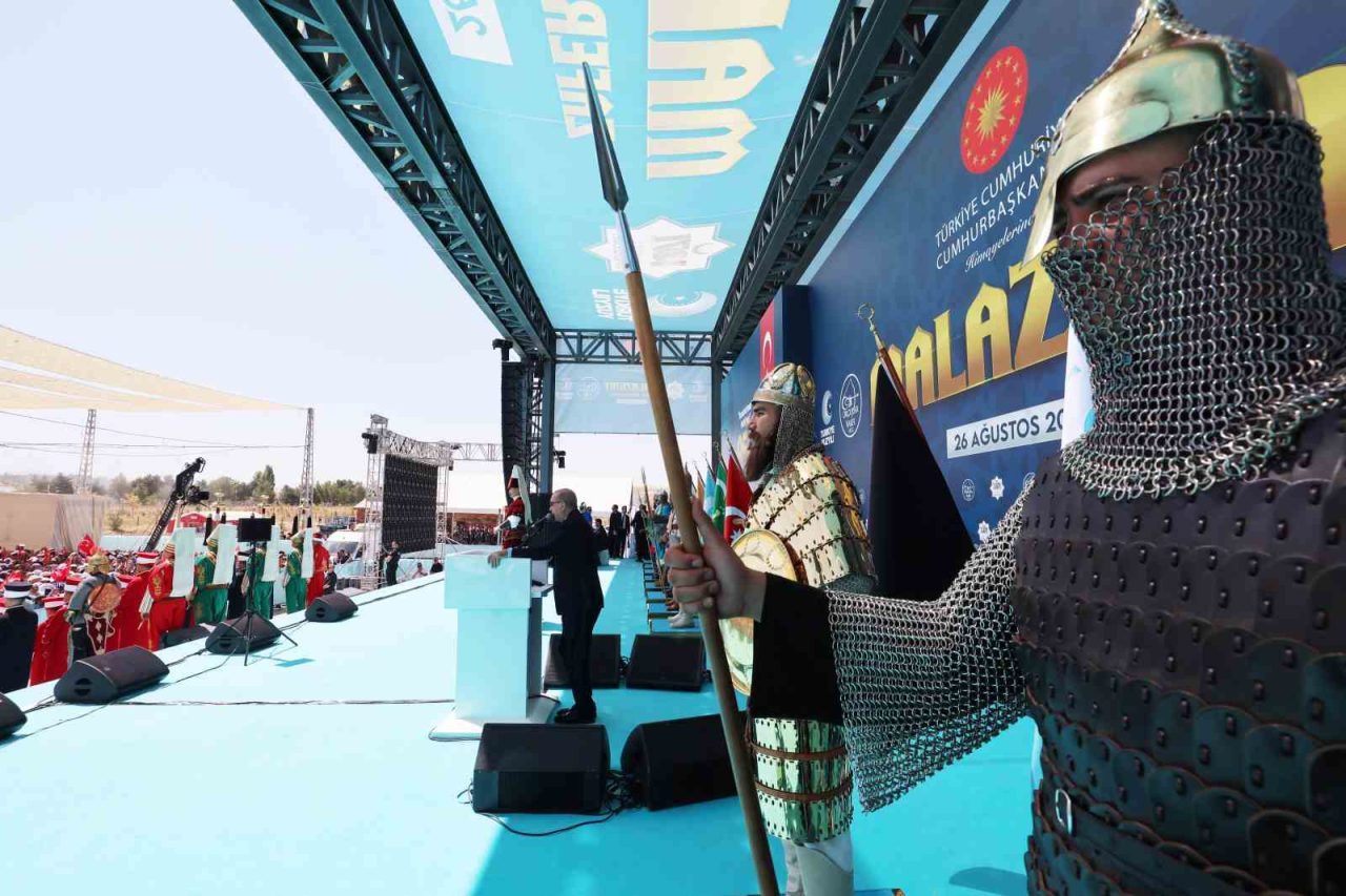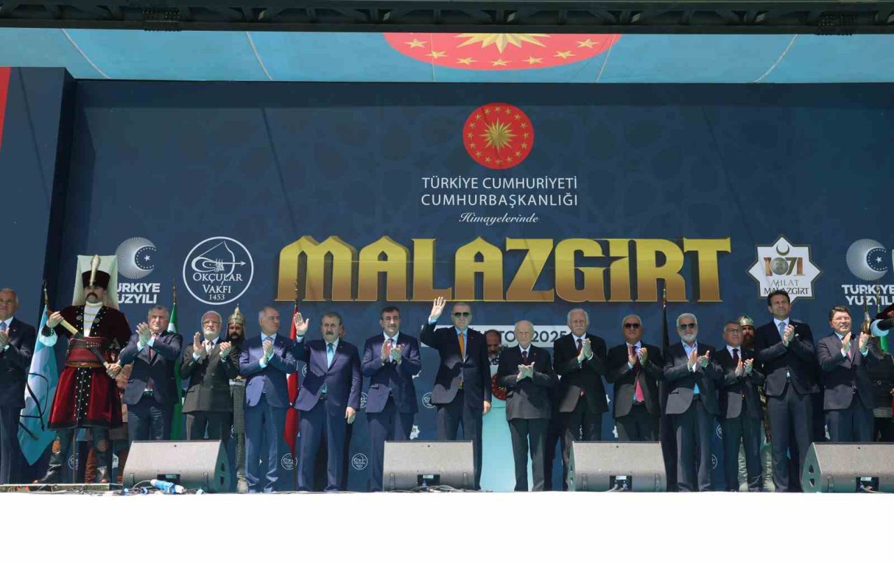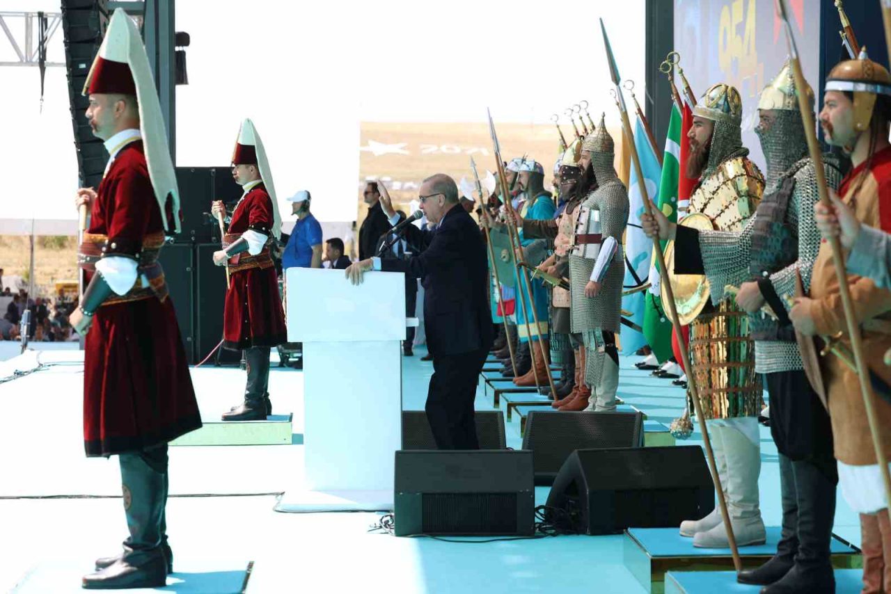ERDOĞAN, “BUGÜN DE SİZLERLE BİRLİKTE O MÜSTESNA ZAFERİN 954. YIL DÖNEMİNDE MALAZGİRT’TEYİZ. BU MEYDANI HINCAHINÇ DOLDURARAK HEYECANIMIZA ORTAK OLAN SİZ KIYMETLİ KARDEŞLERİME AYRI AYRI TEŞEKKÜR EDİYORUM” DEDİ.