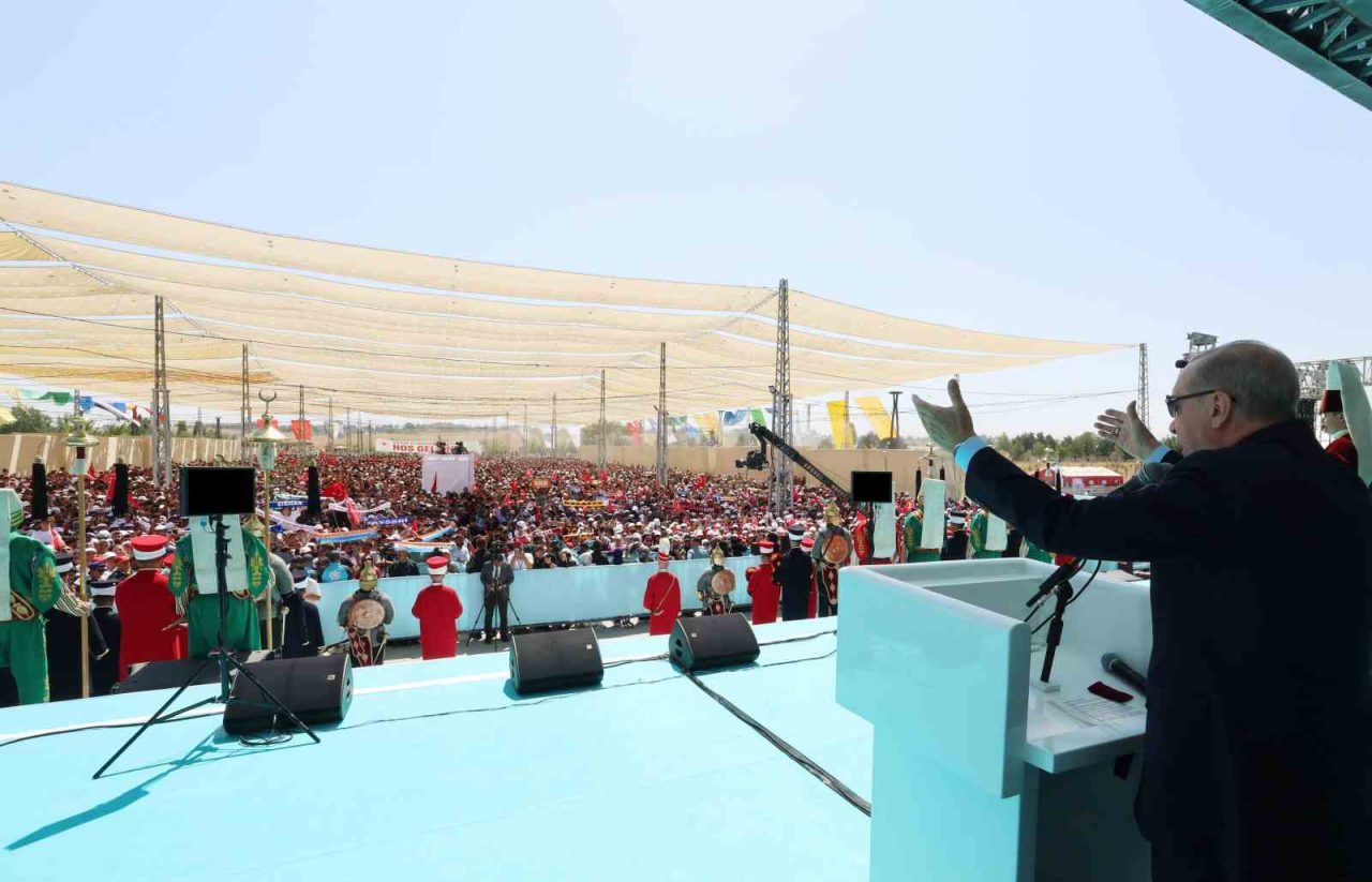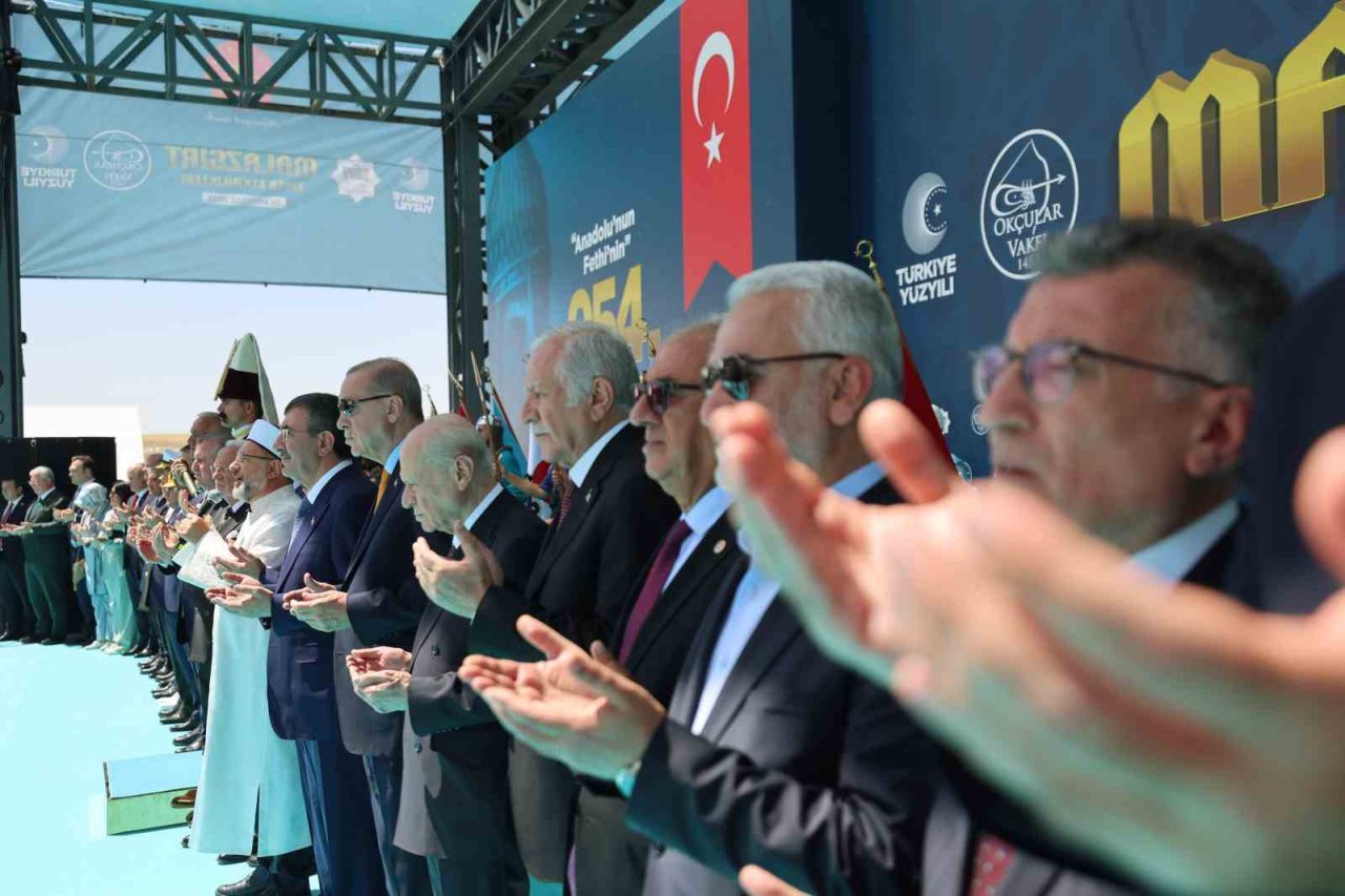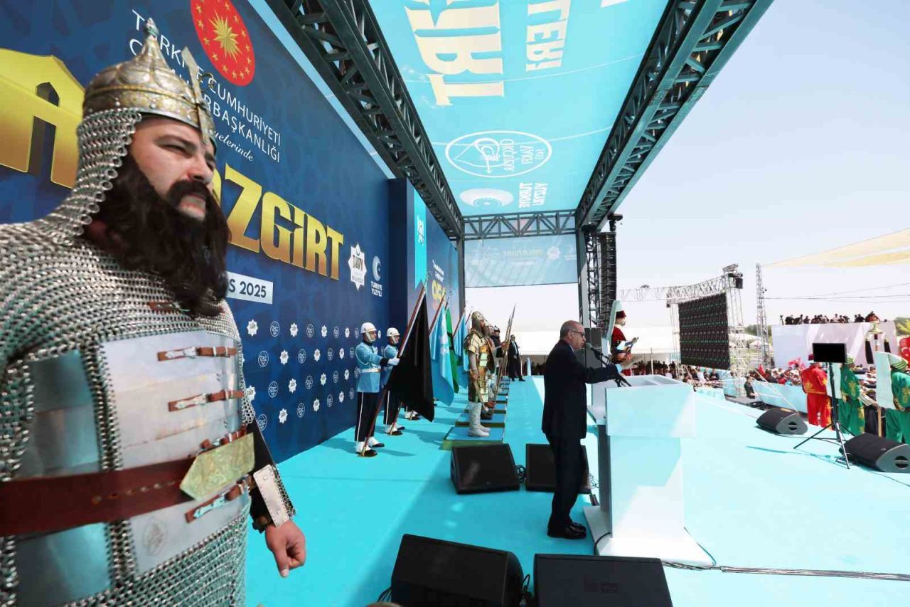 ERDOĞAN, “BUGÜN DE SİZLERLE BİRLİKTE O MÜSTESNA ZAFERİN 954. YIL DÖNEMİNDE MALAZGİRT’TEYİZ. BU MEYDANI HINCAHINÇ DOLDURARAK HEYECANIMIZA ORTAK OLAN SİZ KIYMETLİ KARDEŞLERİME AYRI AYRI TEŞEKKÜR EDİYORUM” DEDİ.