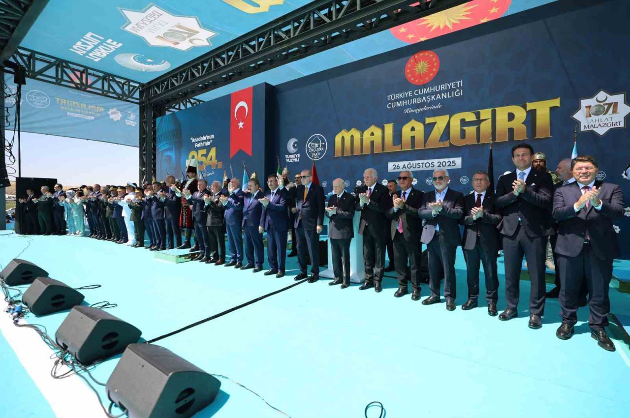 Malazgirt Zaferi’nin 954. yıl dönümü kutlamalarına katılmak üzere dün geldiği Bitlis’in Ahlat ilçesinde geceyi geçiren Cumhurbaşkanı Erdoğan, beraberindeki MHP Lideri Devlet Bahçeli ve bakanlarla öğle saatlerine doğru Muş’un Malazgirt ilçesine geldi. Burada toplanan kalabalığa hitap eden Erdoğan, “Sevgili Muşlu kardeşlerim, ülkemin dört bir yanından şu anda Malazgirt’te bir araya gelen kardeşlerim, Milliyetçi Hareket Partisi’nin Genel Başkanı Sayın Devlet Bahçeli, siyasi partilerimizin saygıdeğer genel başkanları, yarınlarımızın teminatı sevgili gençler, kıymetli hanımefendiler, değerli misafirler, sizleri en kalbi duygularımla, hürmetle, muhabbetle selamlıyorum. Sizlerin şahsında Hakkari’den Edirne’ye, Muğla’dan Kars’a, Hatay’dan Sinop’a 81 ilimizdeki 86 milyon vatandaşımızın tamamına selamlarımı sevgilerimi gönderiyorum. Yine buradan İsrail’in barbar saldırıları altında hayat ve haysiyet mücadelesi veren Gazzeli, Filistinli kardeşlerimizi selamlıyor. Kendilerine dayanışma mesajlarımızı iletiyorum. Dün Ahlat’ta gençlerimizle hasret giderdik. Kubbetül İslam’ın o ferah ve vakur iklimini doya doya teneffüs ettik. Ardından kabine toplantımızı Cumhurbaşkanlığı Ahlat Külliyemizde gerçekleştirdik. Akabinde milletimize yine Ahlat’tan seslendik. Bugün de sizlerle birlikte o müstesna zaferin 954. yıl döneminde Malazgirt’teyiz. Bu meydanı hıncahınç doldurarak heyecanımıza ortak olan siz kıymetli kardeşlerime ayrı ayrı teşekkür ediyorum” dedi.