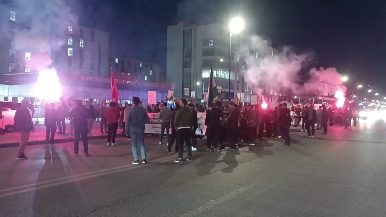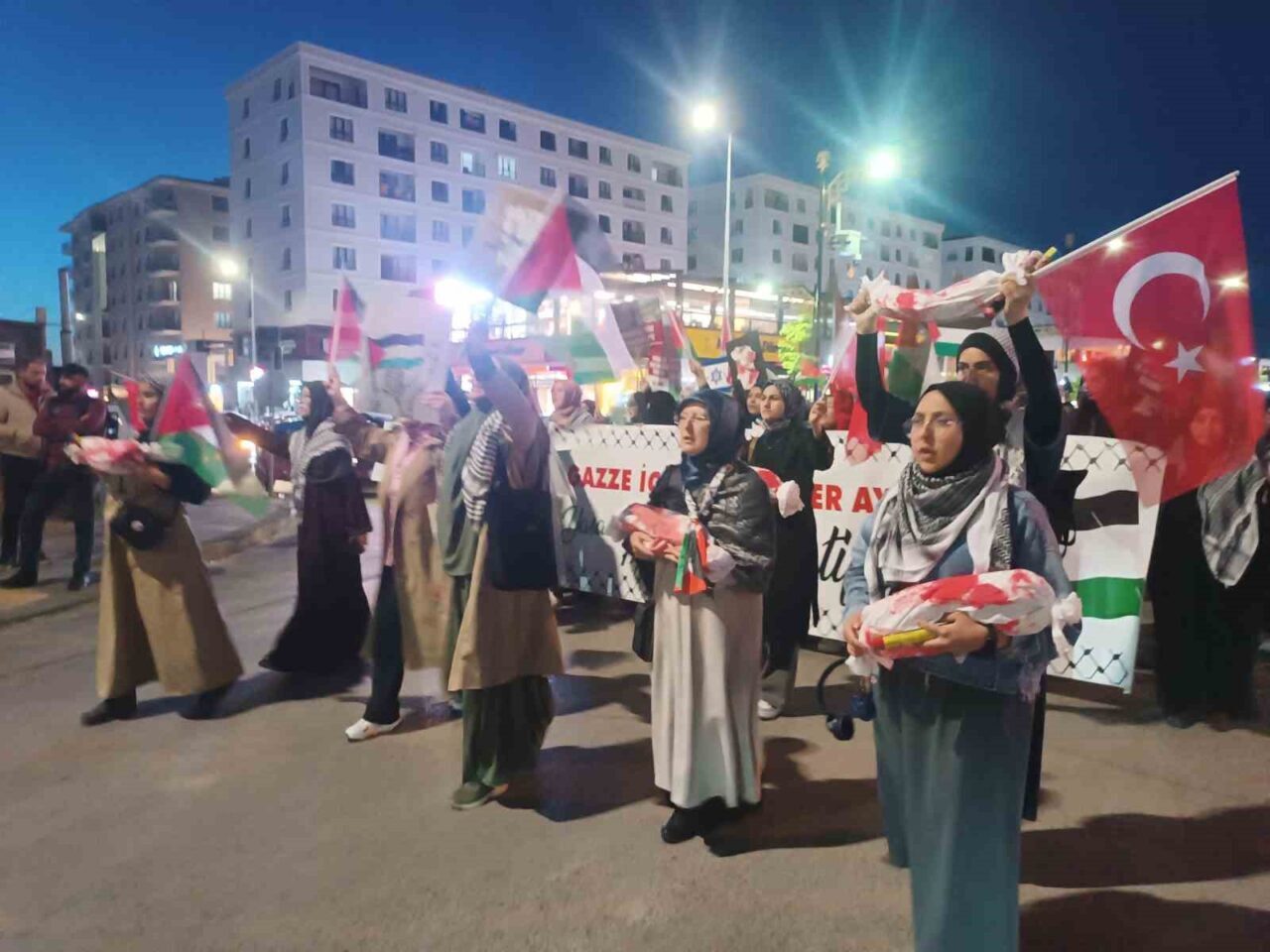 Faldum Köprüsü yan tarafında başlayan protesto yürüyüşü, Taha Akgül Spor Salonu önüne kadar devam etti. Katılımcılar, ellerindeki pankartlar ve bayraklarla birlikte meşale yakıp sloganlar atarak İsrail’i protesto etti. Öğrencilerin hazırlamış oldukları kanlı bebek maketleriyle yürümeleri dikkat çekti. Tekbirler eşliğinde devam eden program yürüyüşün tamamlanmasıyla sona erdi.