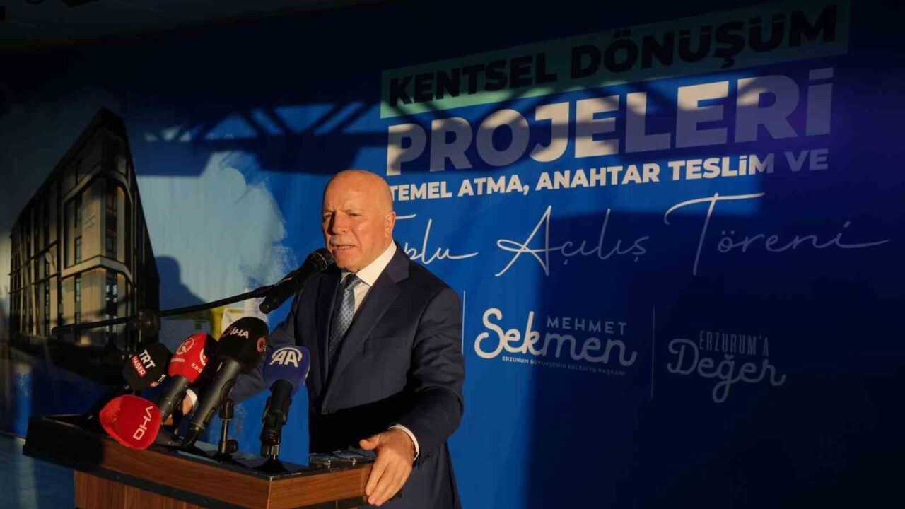 Büyükşehir Belediye Başkanı Mehmet Sekmen ise kentsel dönüşümün bir gerçek olduğunu, illerin, ilçelerin, köylerin ve mahallelerin yeniden yapılanması gerektiğini vurgulayarak, “6 Şubat depremlerinde 11 vilayetimiz yerle bir oldu. Büyük devletimiz Sayın Cumhurbaşkanımızın önderliğinde ekibiyle birlikte altından kalkınmaz denilen böyle büyük bir hareketin hamdolsun yavaş yavaş sonuna gelinmek üzere. Bu gerçekle hareket ederek göreve başladığımızdan itibaren şehrimizde bölge bölge kentsel dönüşüme ağırlık veriyoruz. Diğer hizmetlerimizi de geri bırakmamaya özen gösteriyoruz. Şu anda Erzurum’un 20 ilçesinde yoğun bir çalışma yürütülüyor” dedi.