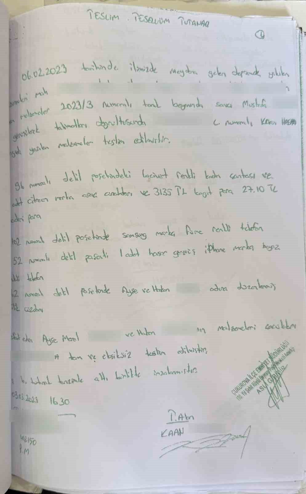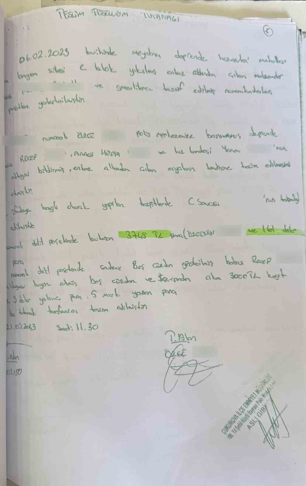 POLİS MEMURU E.C.’NİN DEPREMDE HAYATINI KAYBEDENLERİN YAKINLARINA ZİYNET EŞYALARI TESLİM EDERKEN TUTTUĞU TUTANAK.