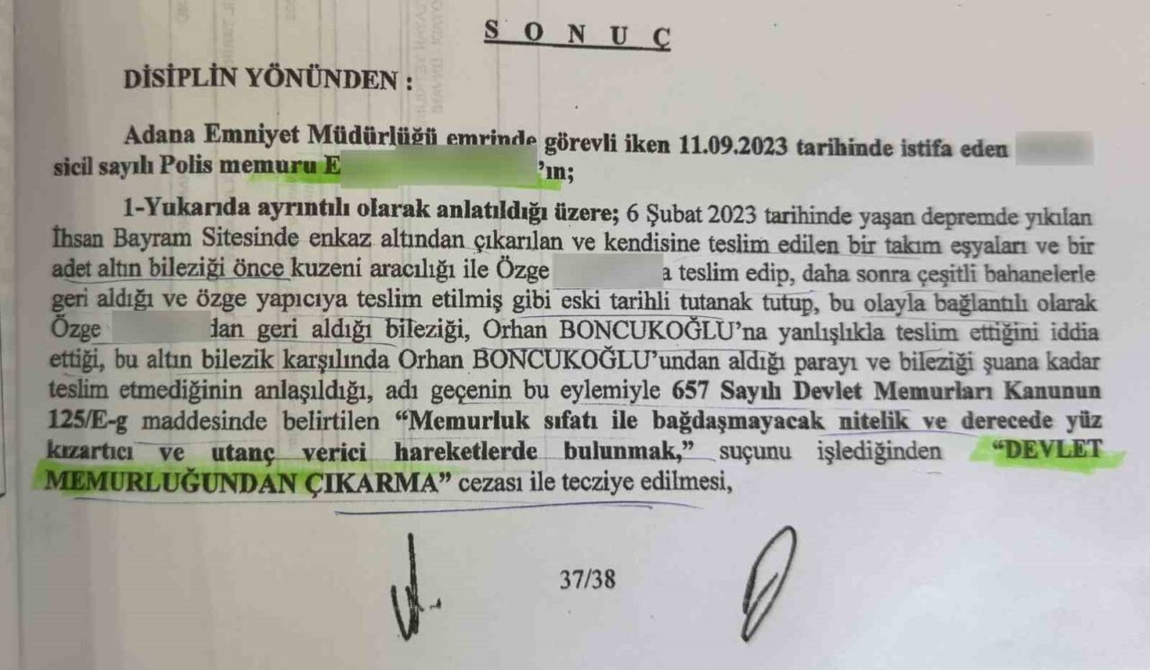 ADANA’DA DEPREMDE YIKILAN BİNANIN ENKAZINDAN ÇIKAN ALTINLARI, HAYATINI KAYBEDENLERİN YAKINLARINA TESLİM ETTİKTEN SONRA, ‘SAVCILIK GERİ İSTİYOR, BÜTÜN ALTINLAR TOPLANDIKTAN SONRA YENİDEN TESLİM EDECEĞİZ’ DİYEREK ZİMMETİNE GEÇİRDİĞİ TESPİT EDİLEN POLİS MEMURU HAKKINDA 2 KEZ ‘DEVLET MEMURLUĞUNDAN ÇIKARTMA’ CEZASI VERİLDİ.
