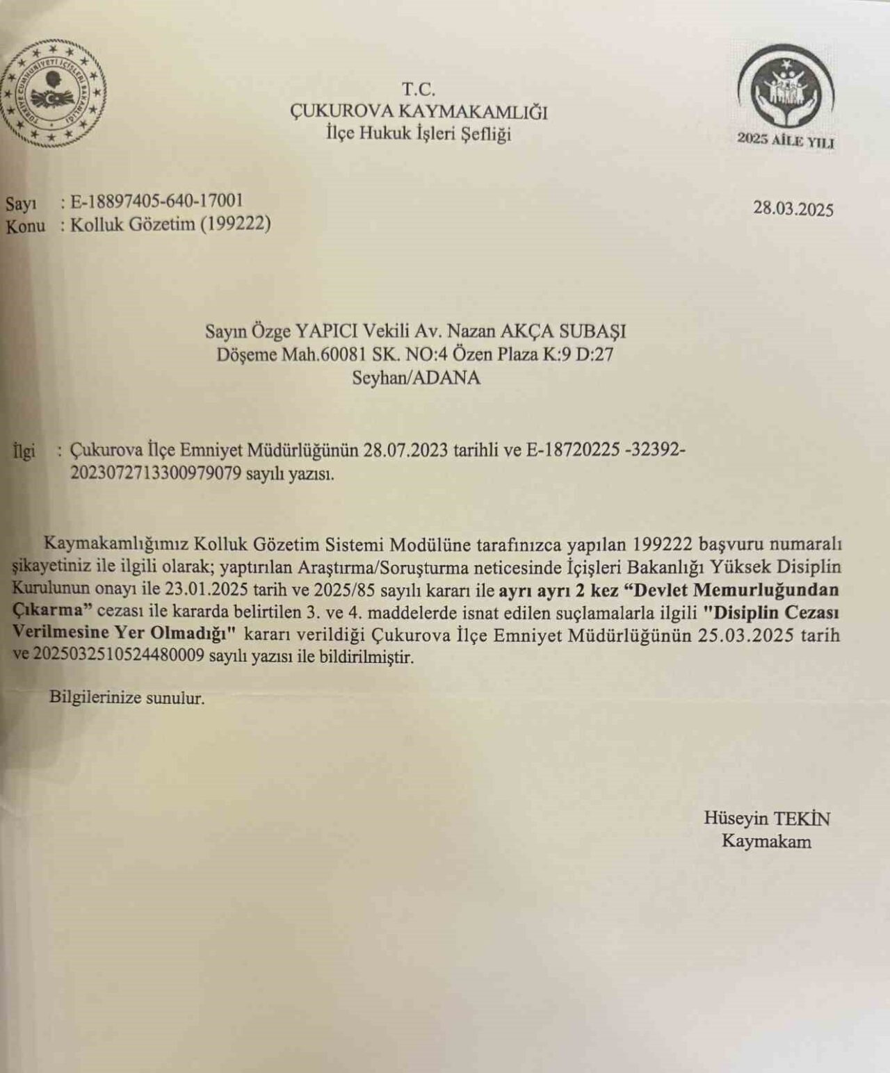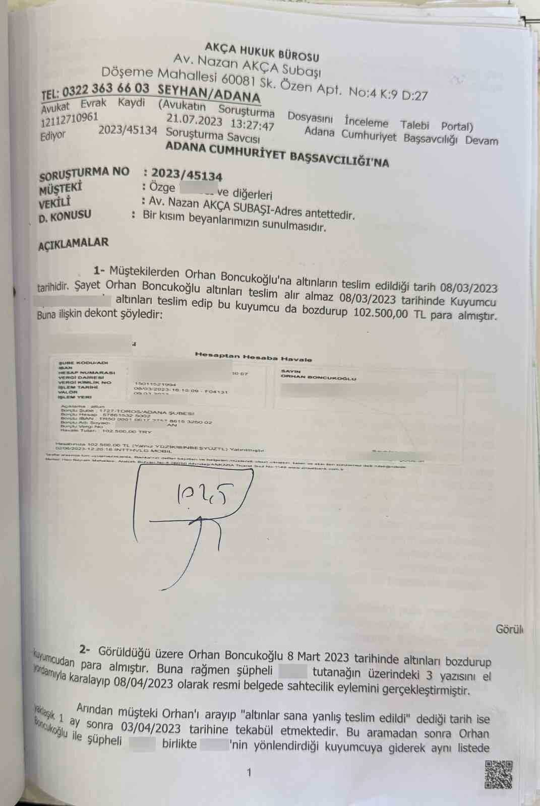 Ancak bir süre sonra altınlar geri gelmedi, polis memuru da şüpheli cevaplar vermeye başladı. Mağdurlar, aynı apartmanda gelini ve 2 yeğenini kaybeden Avukat Nazan Akça Subaşı’ya ulaştı. Avukat Subaşı, polis memuru E.C. hakkında Adana Cumhuriyet Başsavcılığı’na suç duyurusunda bulundu. Ancak dönemin savcısı takipsizlik kararı verdi. Bunun üzerine avukat Subaşı, savcının verdiği takipsizlik kararı üzerine Sulh Ceza Mahkemesi’ne başvurdu ve dönemin savcısının verdiği karar kaldırılıp soruşturma izni verildi. Bunun üzerine Emniyet Genel Müdürlüğü konuyla ilgili müfettiş görevlendirdi.