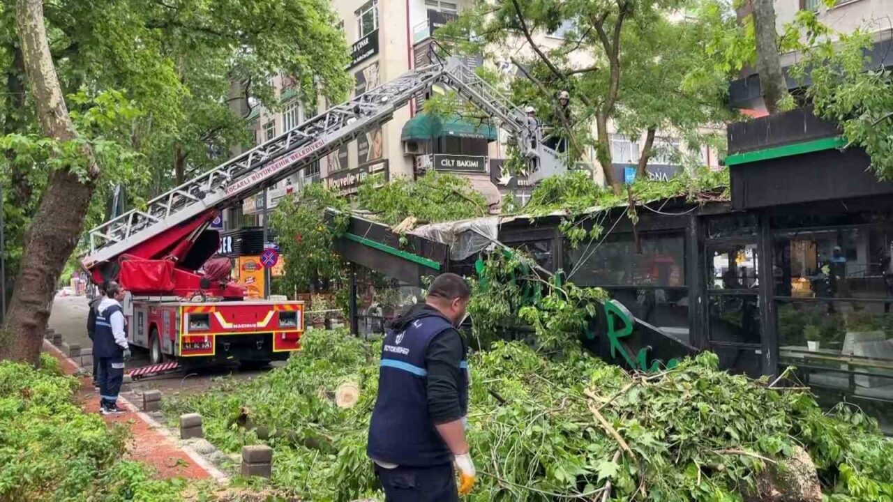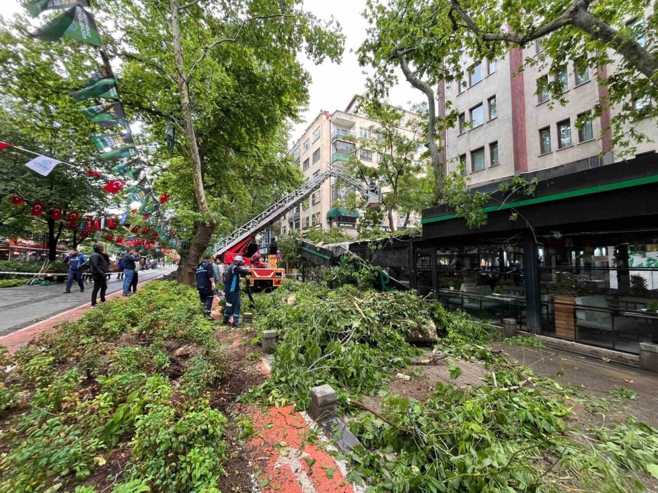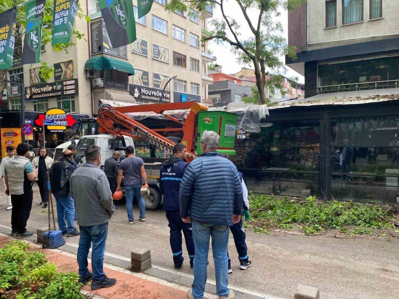 Kocaeli’nin İzmit ilçesinde öğle saatlerinde etkili olan şiddetli rüzgar ve sağanak yağış, günlük yaşamı olumsuz etkiledi. İzmit’in Ömerağa Mahallesi Yürüyüş Yolu üzerinde, fırtına nedeniyle devrilen asırlık bir çınar ağacı bir kafeteryanın üzerine düştü. Olayda iki kişi yaralanırken, çevrede büyük panik yaşandı.