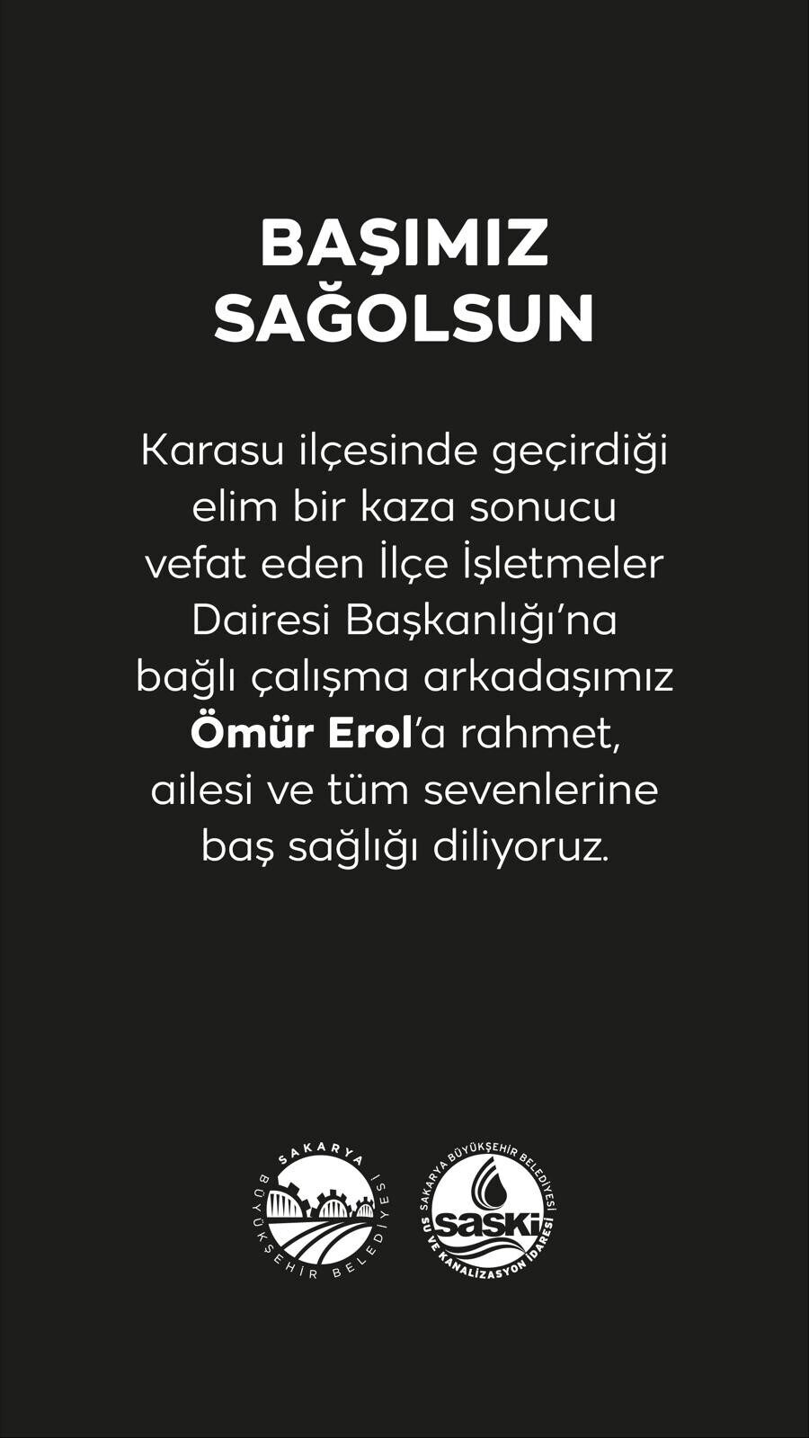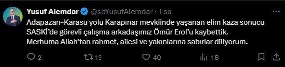 Kazada hayatını kaybeden sürücü için SASKİ ve Sakarya Büyükşehir Belediye Başkanı Yusuf Alemdar sosyal medyadan taziye mesajı yayımladı.