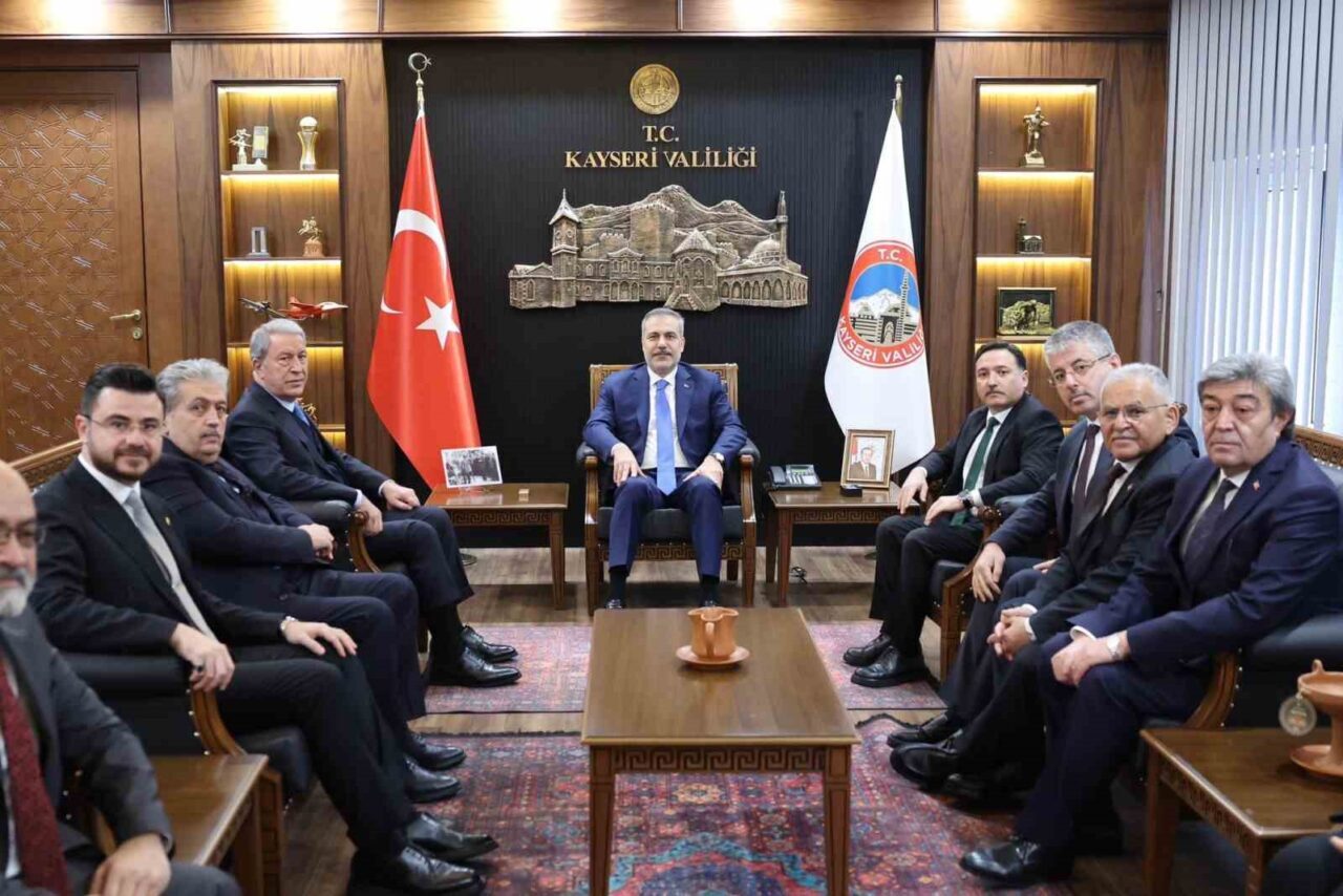 Kayseri Havaalanı’na iniş yapan Dışişleri Bakanı Hakan Fidan, ilk olarak Kayseri Valisi Gökmen Çiçek’i ziyaret etti. Kayseri Valiliği’nin şeref defterini imzalayan Bakan Fidan, burada bir süre Vali Çiçek ile görüştü. Ardından Kayseri Büyükşehir Belediye Başkanı Dr. Memduh Büyükkılıç’a nezaket ziyaretinde bulunan Fidan’a Büyükkılıç tarafından belediyenin çalışmaları hakkında bilgiler verildi.