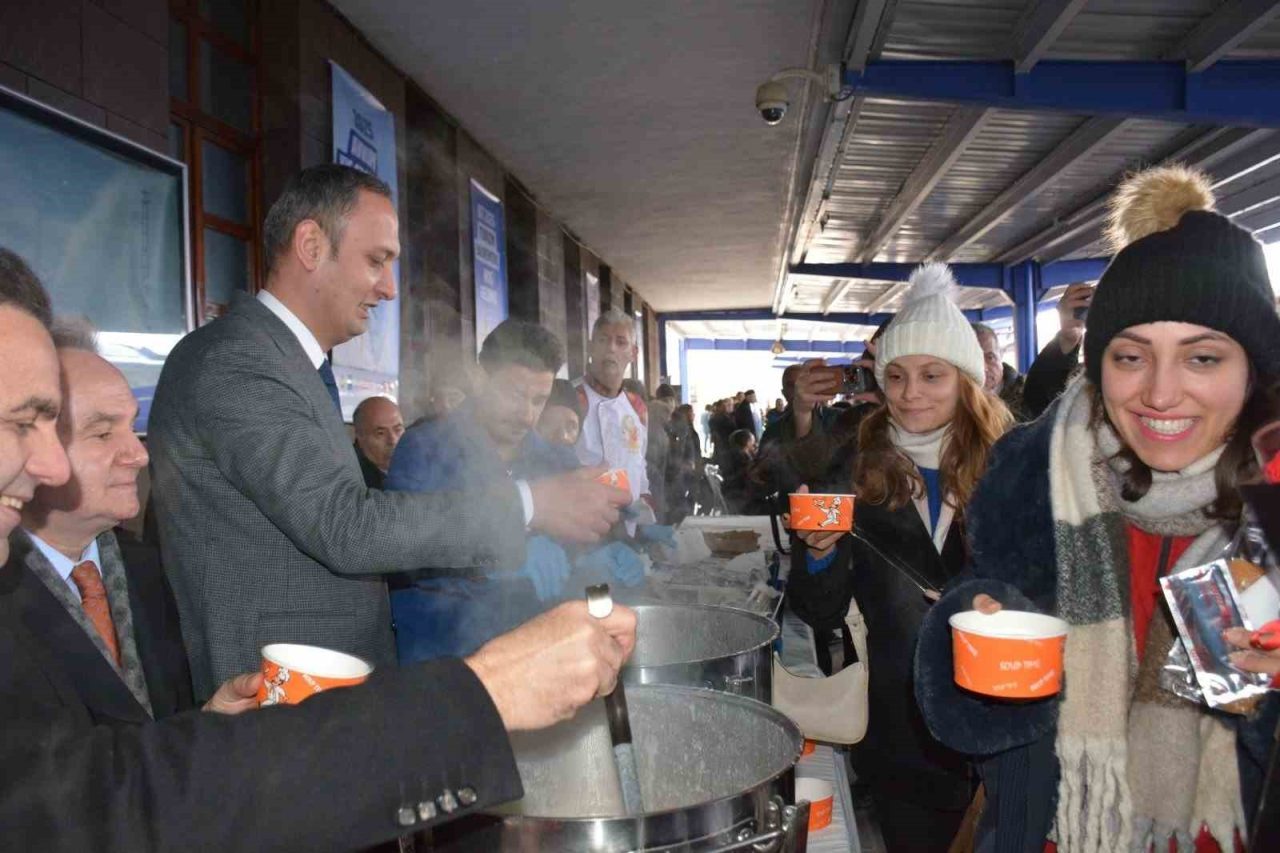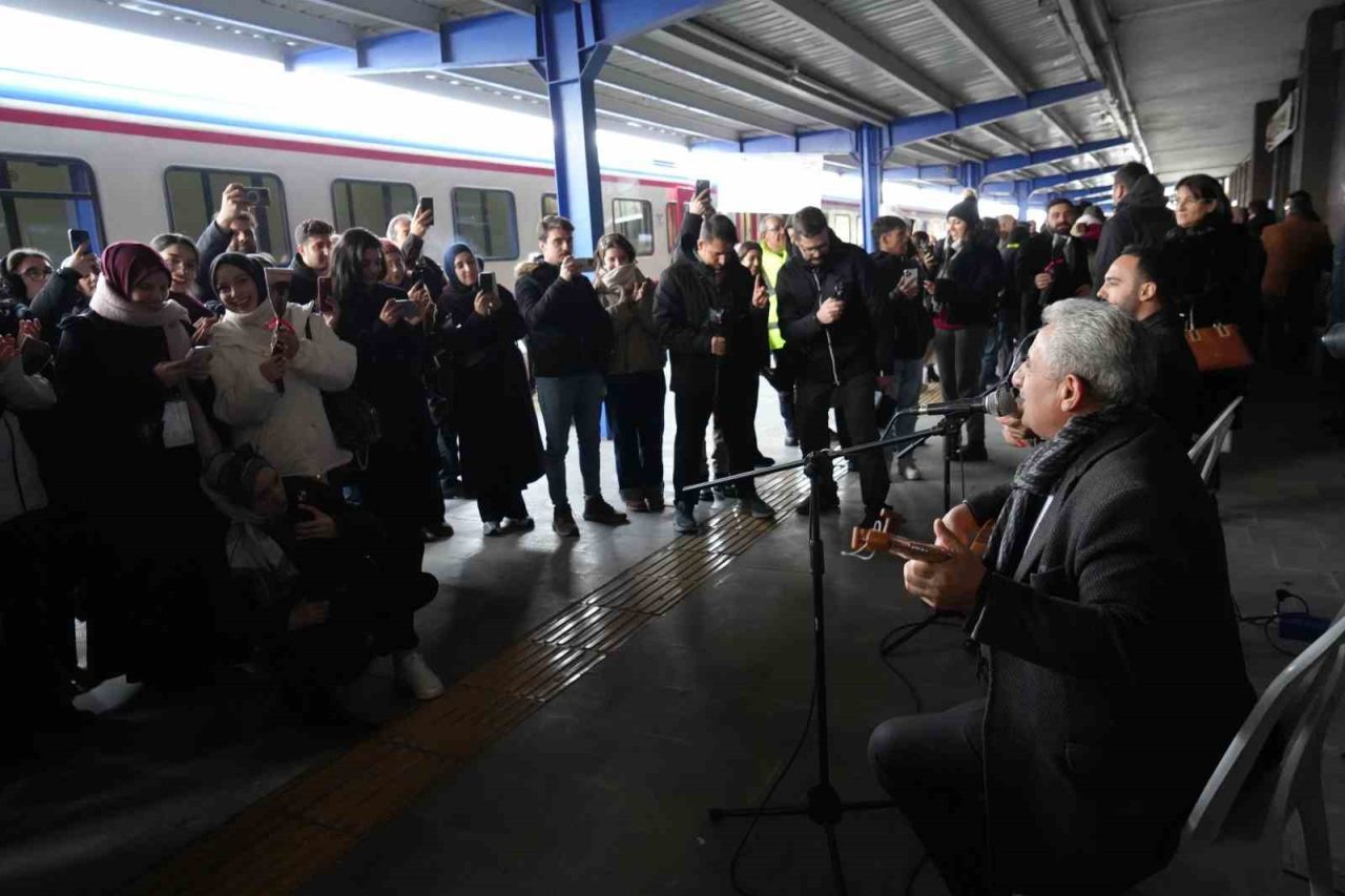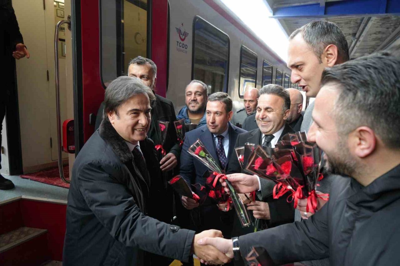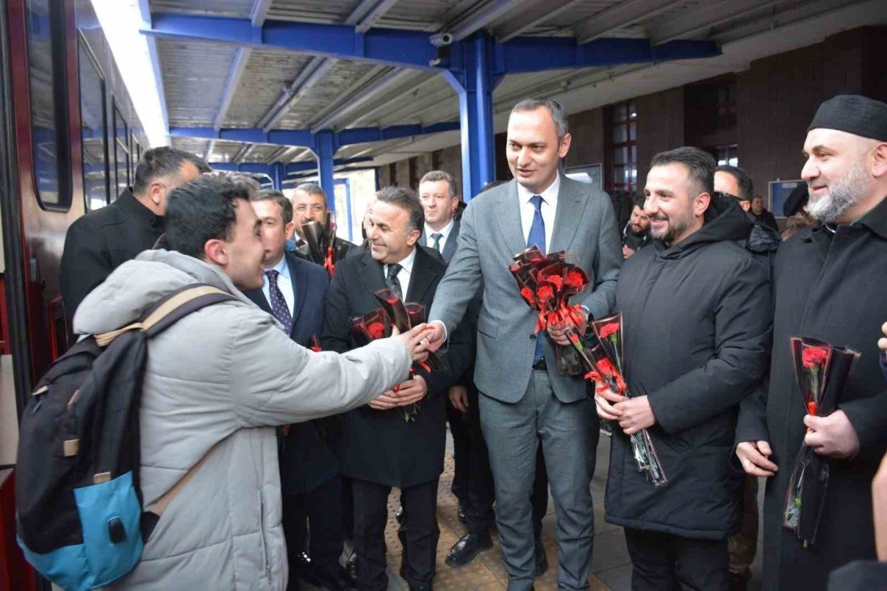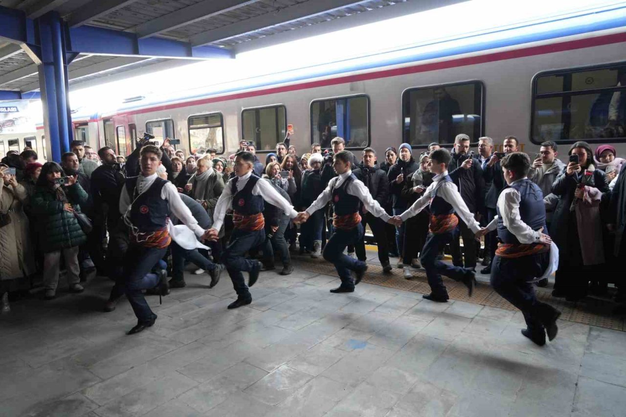 TRENDEN İNEN YOLCULARA KARANFİL VERİLDİ, ERZURUM HALK OYUNLARI EKİBİ GÖSTERİ YAPTI, YOLCULARA AYRAN AŞI ÇORBASI, KADAYIF DOLMASI, KAHVE VE ÇAY İKRAMI YAPILDI.