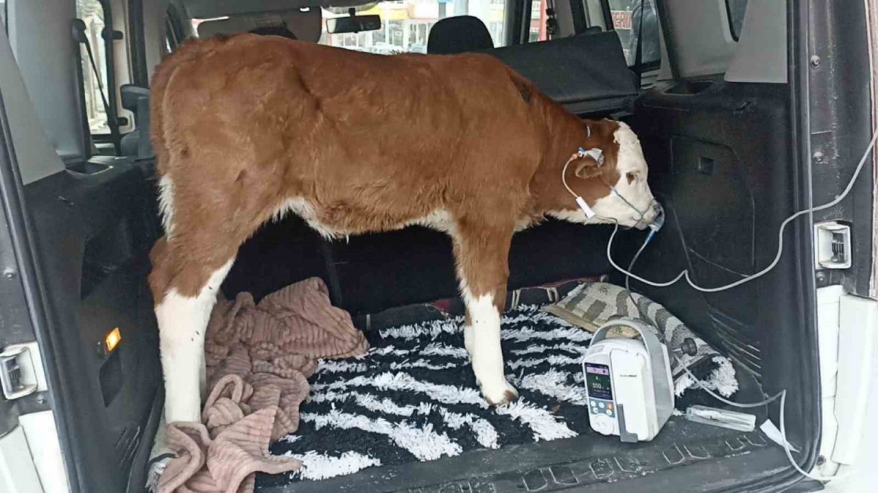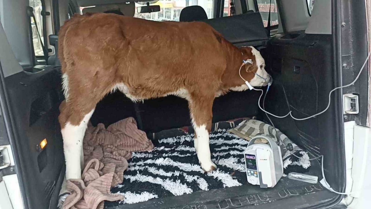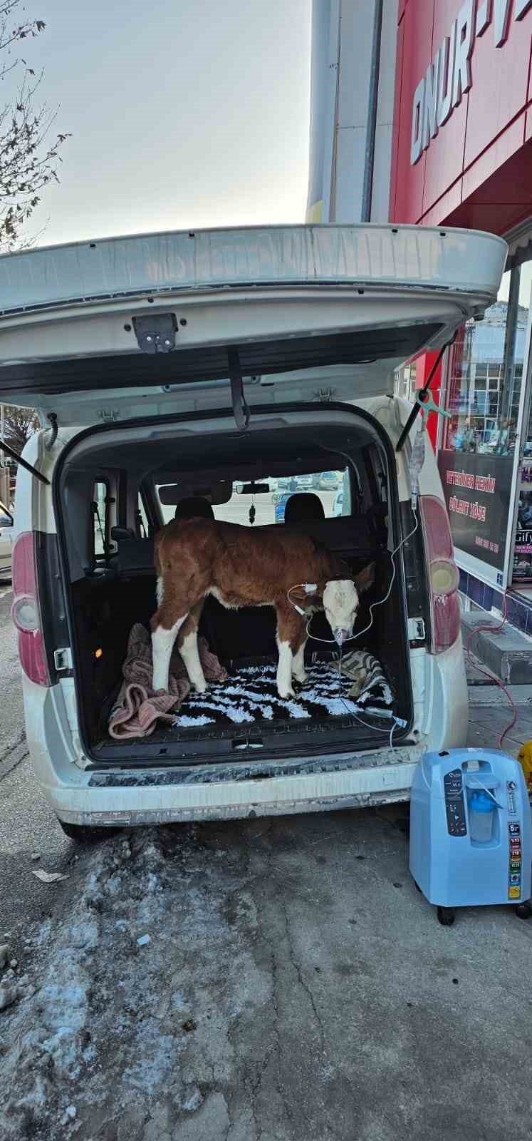 SİVAS’TA ISINMASI İÇİN AHIRDA YAKILAN ATEŞİN DUMANINDAN ZEHİRLENEN 6 GÜNLÜK BUZAĞIYA, OTOMOBİLİN BAGAJINDA ACİL MÜDAHALE YAPILDI.