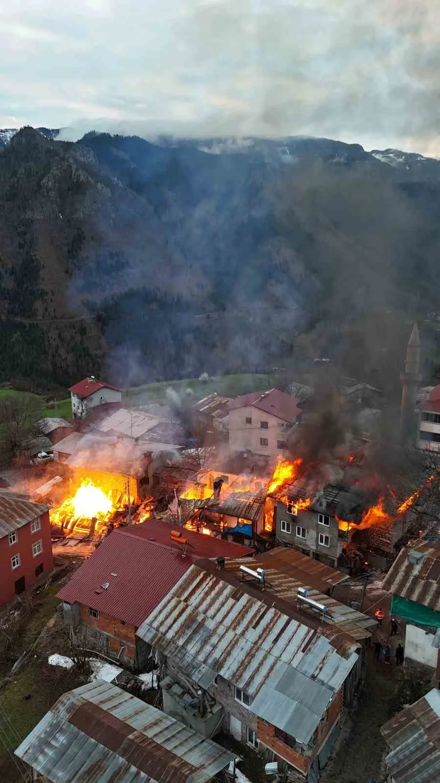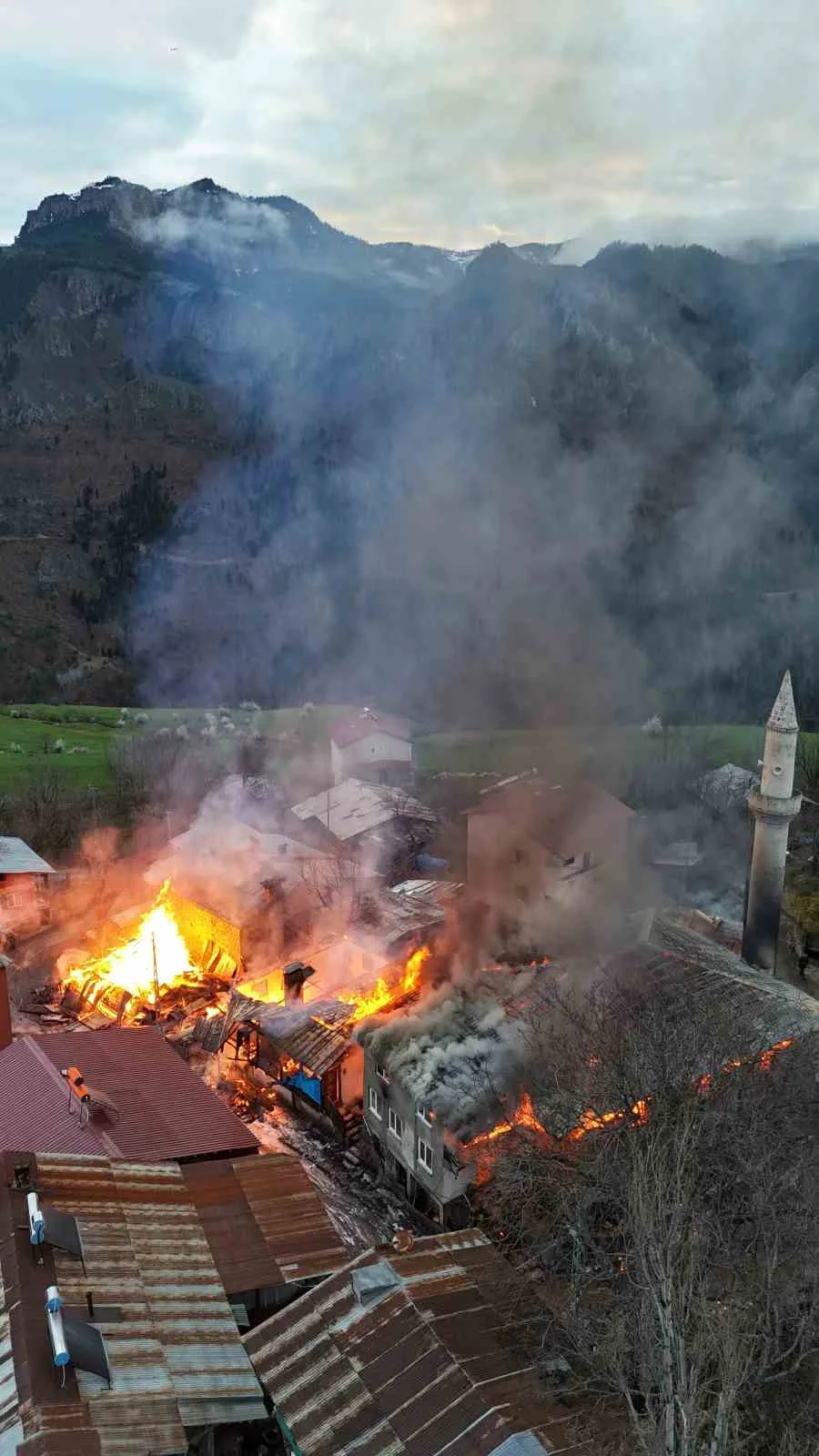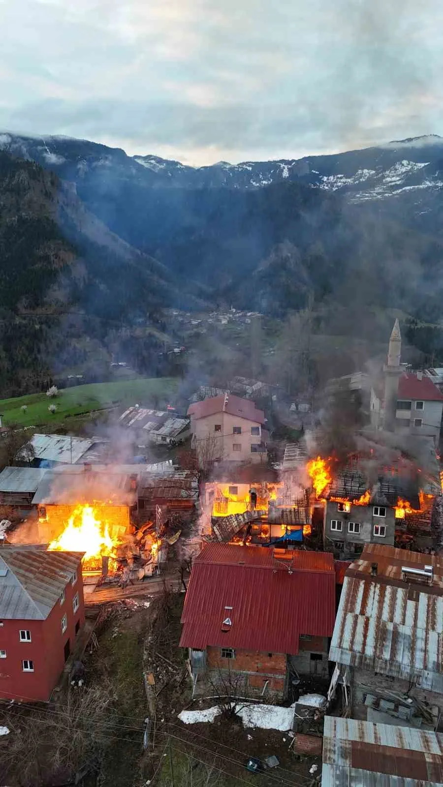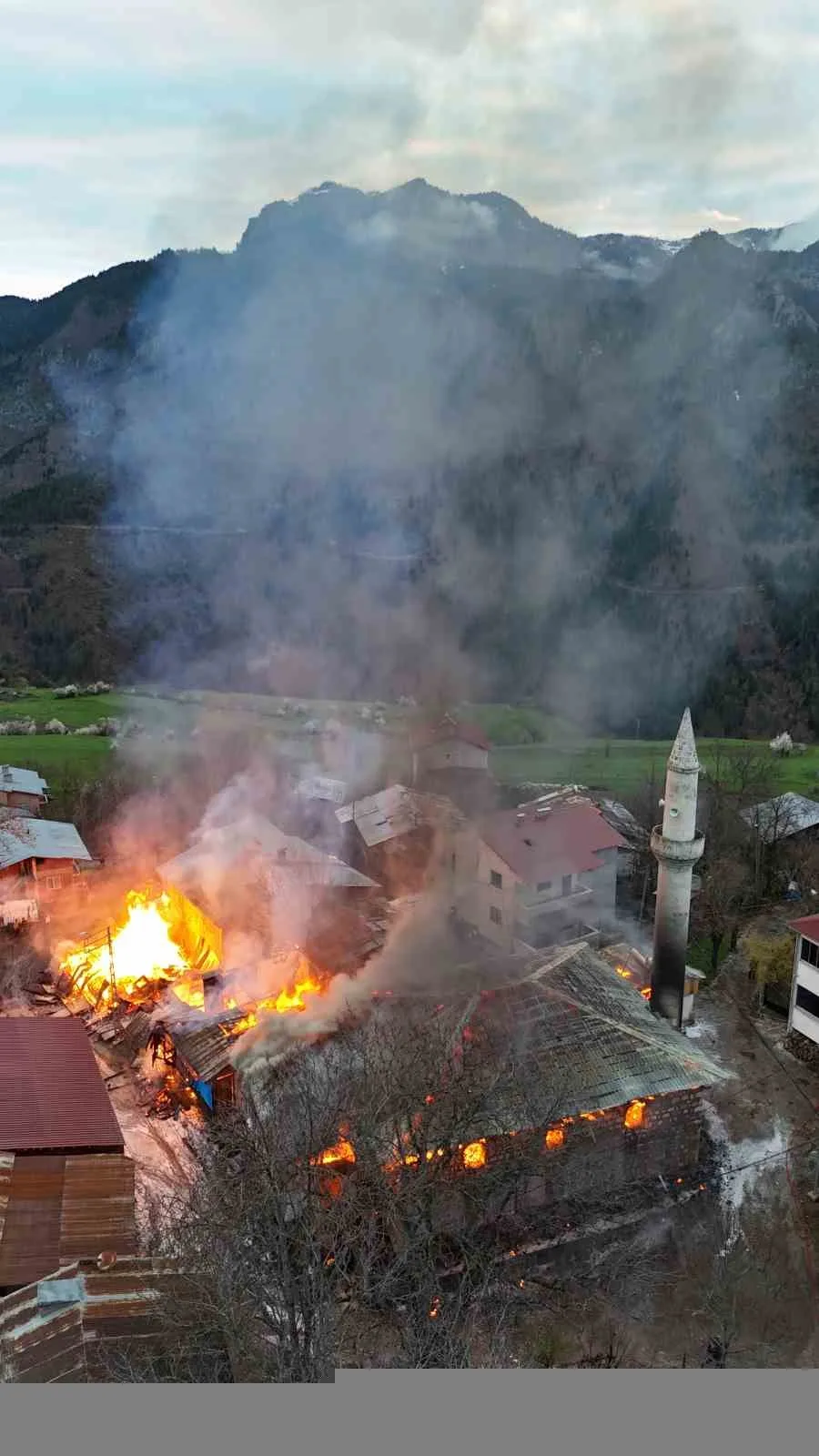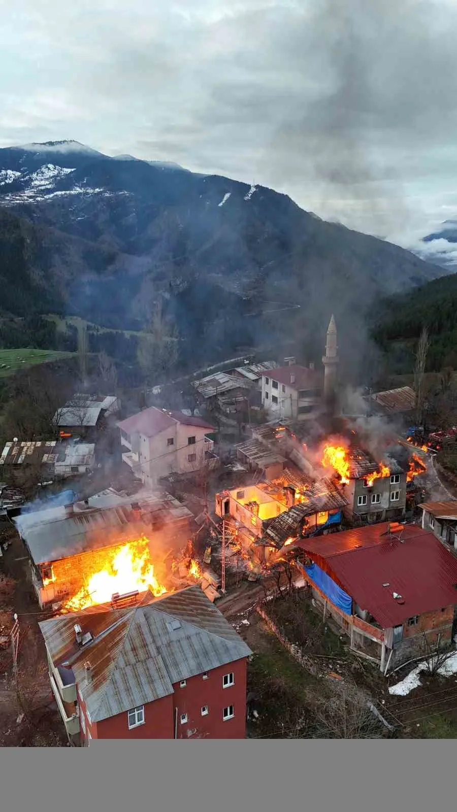 İtfaiye ekipleri yangına müdahale ederek söndürürken, yangında ilgili yeni görüntüler ortaya çıktı. Köy sakinlerinden Yunus Meydan tarafından yangın dron kamerasıyla görüntülendi. Görüntülerde, köyün ortasında bulunan evlerde çıkan yangın felaketi bir kez daha gözler önüne serildi.