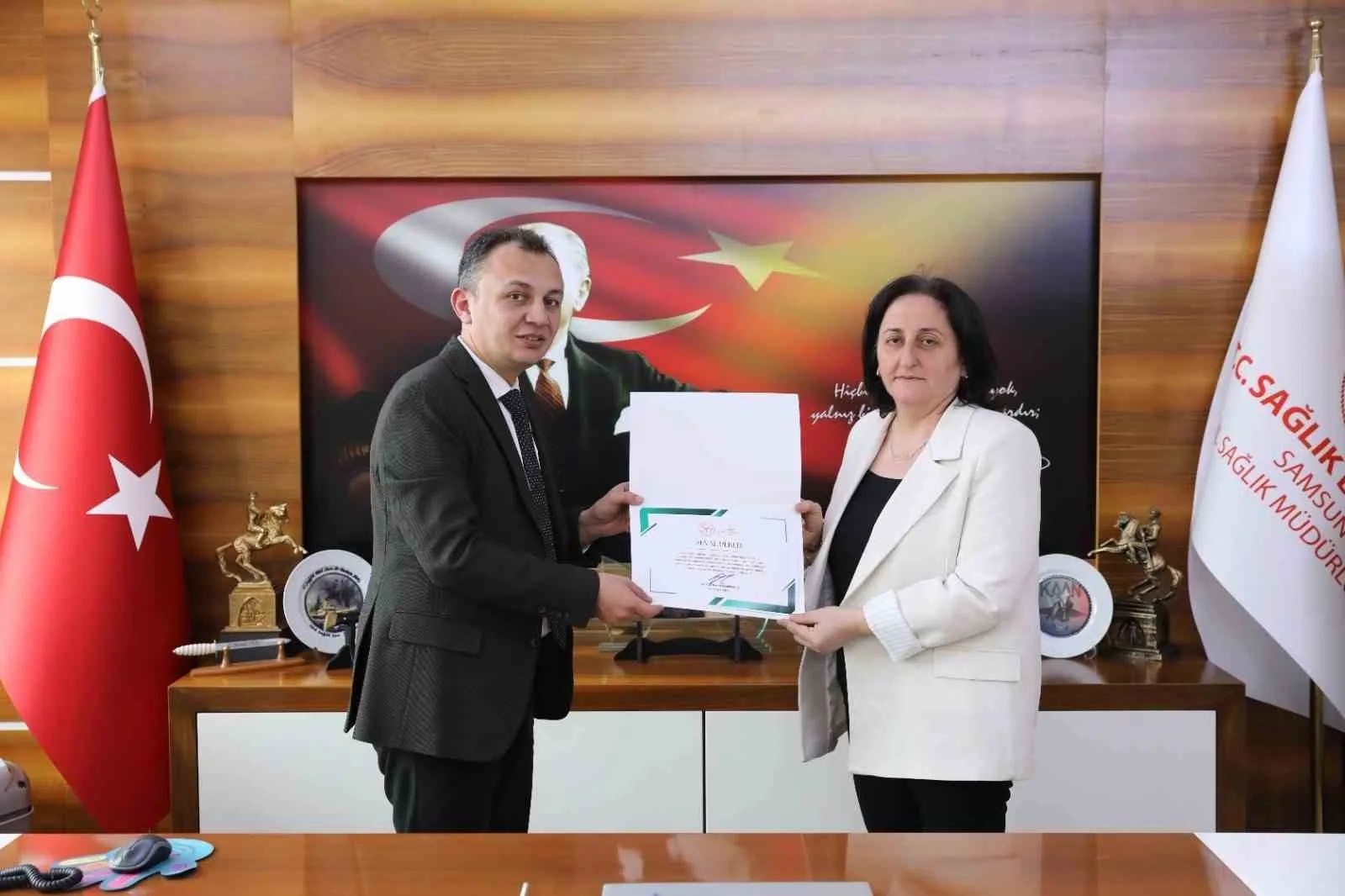 VEZİRKÖPRÜ DEVLET HASTANESİ’NDE 15 YILDIR DOĞUMHANE SORUMLUSU OLARAK GÖREV YAPAN EBE SEVAL PEKER’E, SAĞLIK BAKANLIĞI TARAFINDAN VERİLEN TEŞEKKÜR BELGESİ, SAMSUN İL SAĞLIK MÜDÜRÜ UZM. DR. MUSTAFA URAS TARAFINDAN KENDİSİNE TAKDİM EDİLDİ.