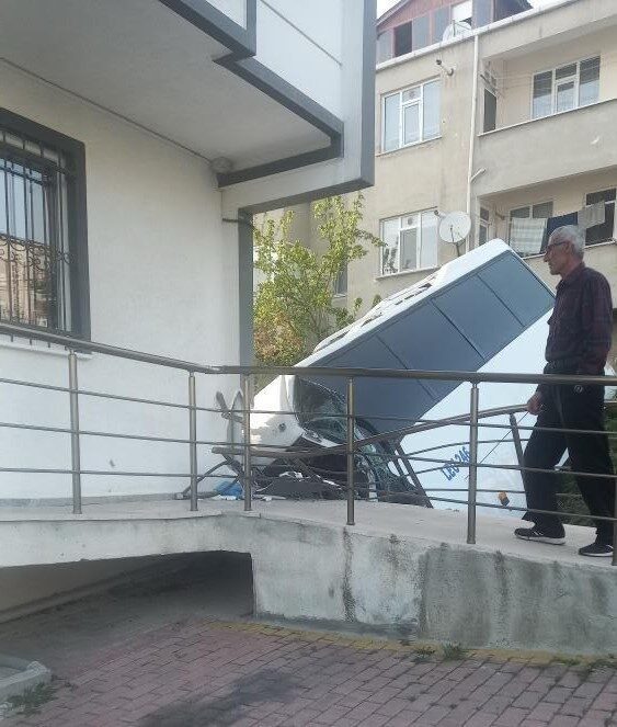 Kocaeli’nin Çayırova ilçesinde el freni boşalan park halindeki midibüs, apartman duvarına çarparak durabildi. Aracın boş olması ve çevrede kimsenin olmaması sebebiyle şans eseri yaralanan olmadı. Kaza anı güvenlik kamerasına yansıdı.