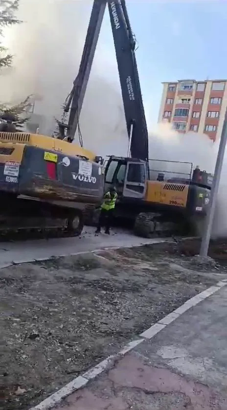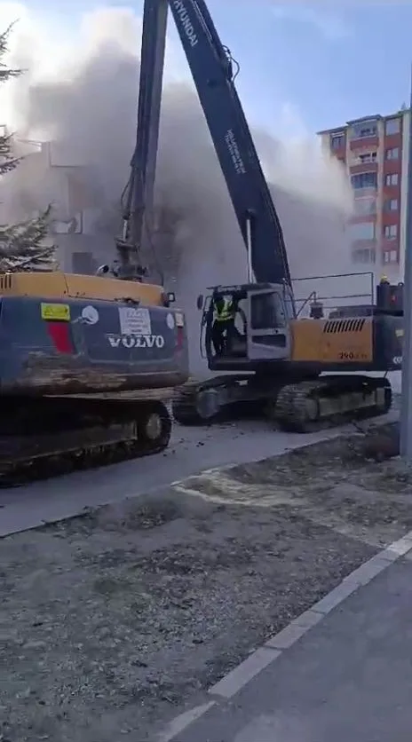 ELAZIĞ’DA AĞIR HASARLI 5 KATLI BİNA, KEPÇENİN TEK DOKUNUŞU İLE YERLE BİR OLDU. KEPÇE OPERATÖRÜ, TAŞ PARÇALARINDAN ARAÇTAN ATLAYARAK KURTULDU.