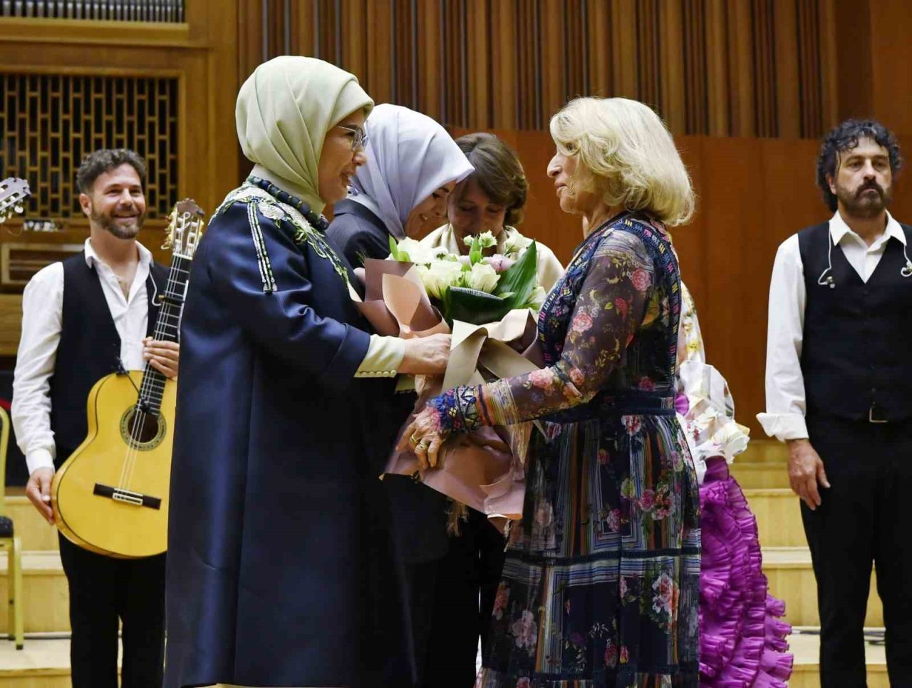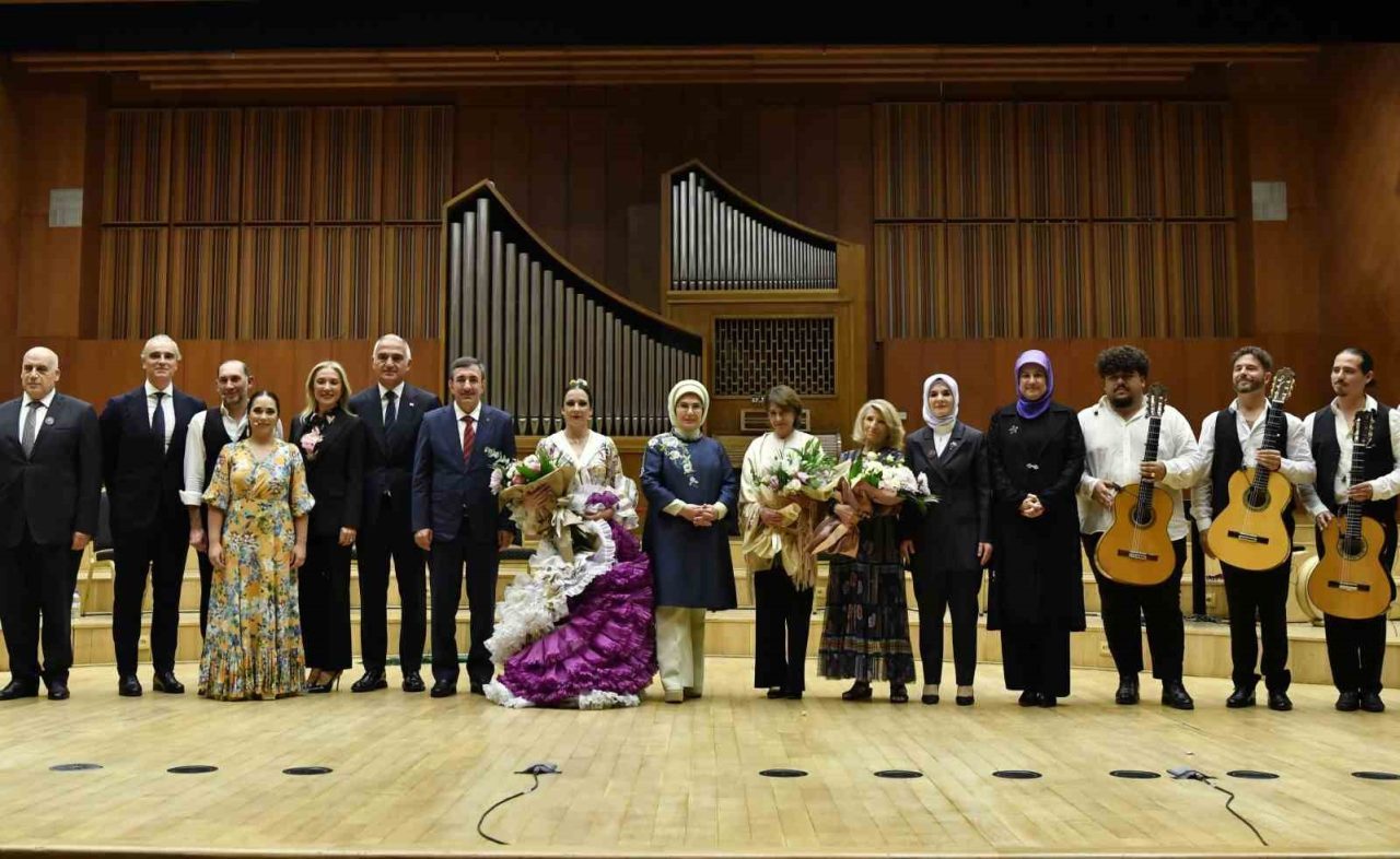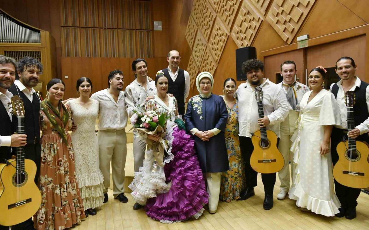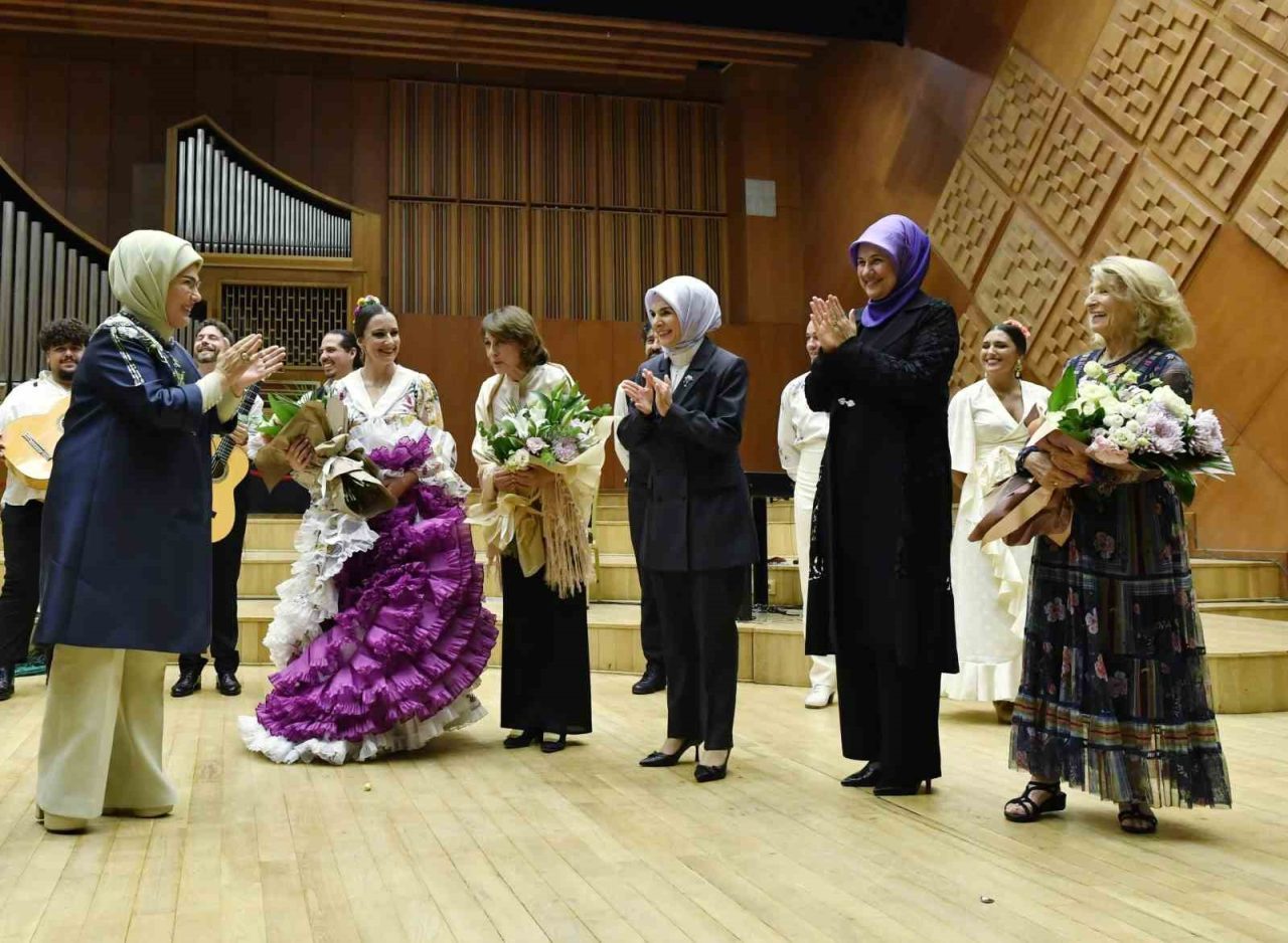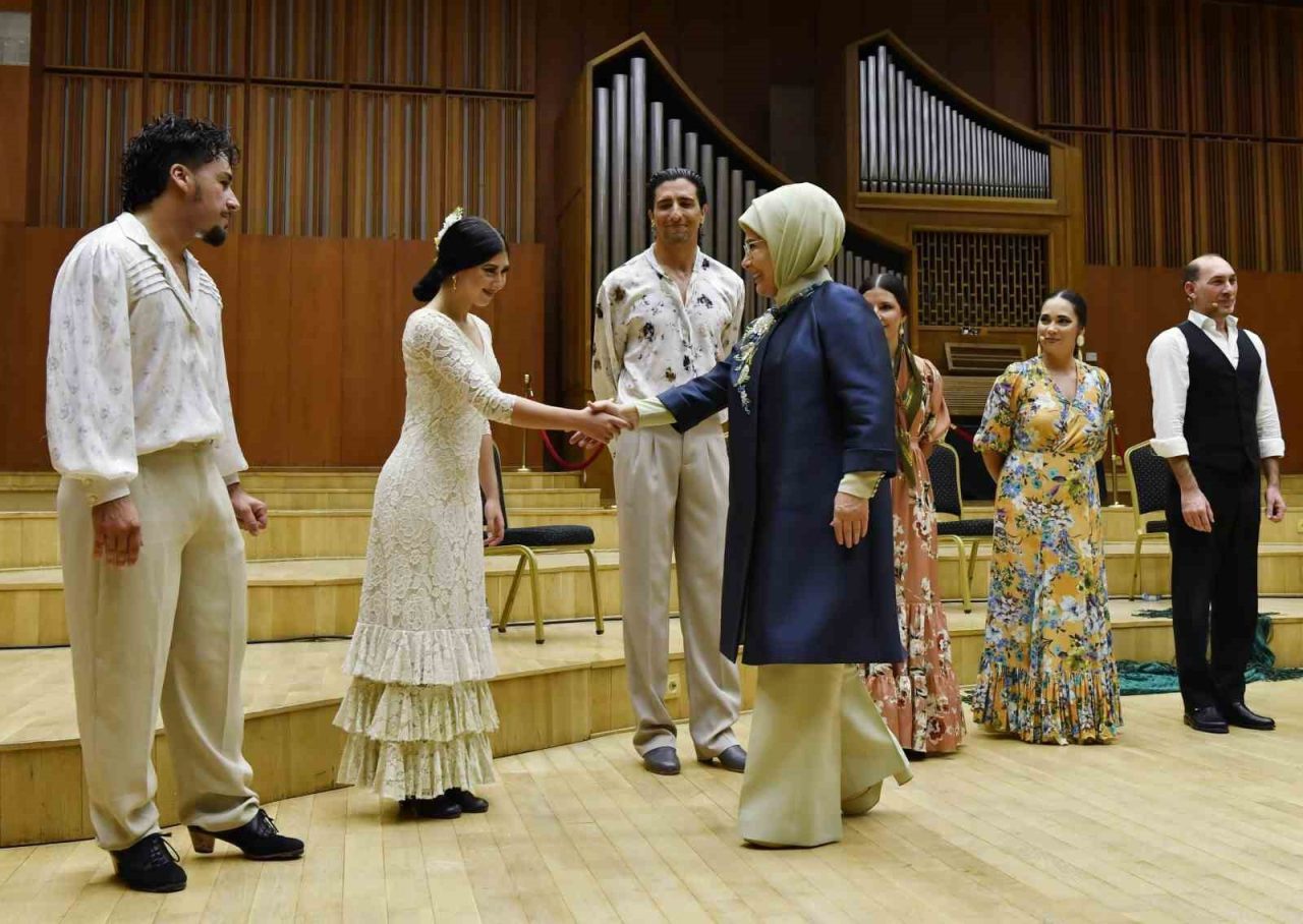 Emine Erdoğan, gösterinin ardından Sevilla Cristina Heeren Flamenko Sanatı Vakfı Başkanı Cristina Heeren’e ve dansçılara çiçek takdim etti.