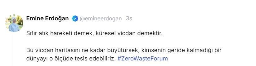 CUMHURBAŞKANI RECEP TAYYİP ERDOĞAN’IN EŞİ EMİNE ERDOĞAN, 17-19 EKİM TARİHLERİ ARASINDA “SIFIR ATIK HAREKETİ: İNSAN, MEKAN, DÖNÜŞÜM” TEMASIYLA İSTANBUL’DA DÜZENLENEN ULUSLARARASI SIFIR ATIK FORUMU’NA İLİŞKİN PAYLAŞIMDA BULUNDU.