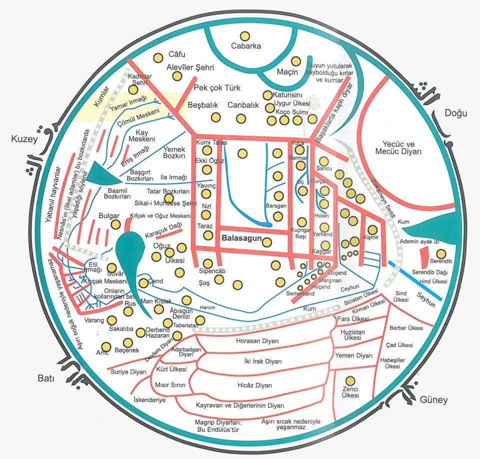 KAŞGARLI MAHMUD, 1075 YILINDA YAYINLADIĞI TÜRKÇE-ARAPÇA SÖZLÜK OLAN DİVAN-U LUGATİ’T TÜRK’E, TÜRK DÜNYASININ NE KADAR BÜYÜK OLDUĞUNU GÖSTEREN BİR DE HARİTA EKLEMİŞ.