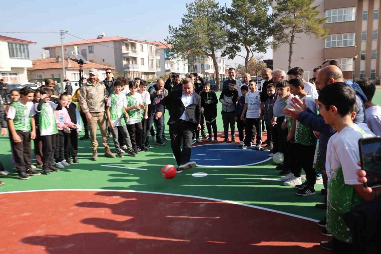 Açıklamaların ardından Vali Aydoğdu ve birim amirleri, öğrencilerle birlikte kauçuk zeminli oyun alanında futbol oynadı.