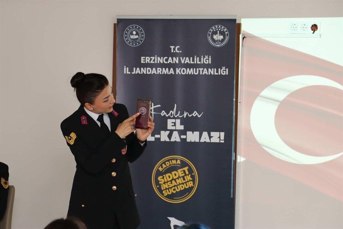 Erzincan İl Jandarma Komutanlığı tarafından kadın öğrencilere yönelik “Kadına Yönelik Şiddetle Mücadele” kapsamında bilgilendirme faaliyeti gerçekleştirildi.