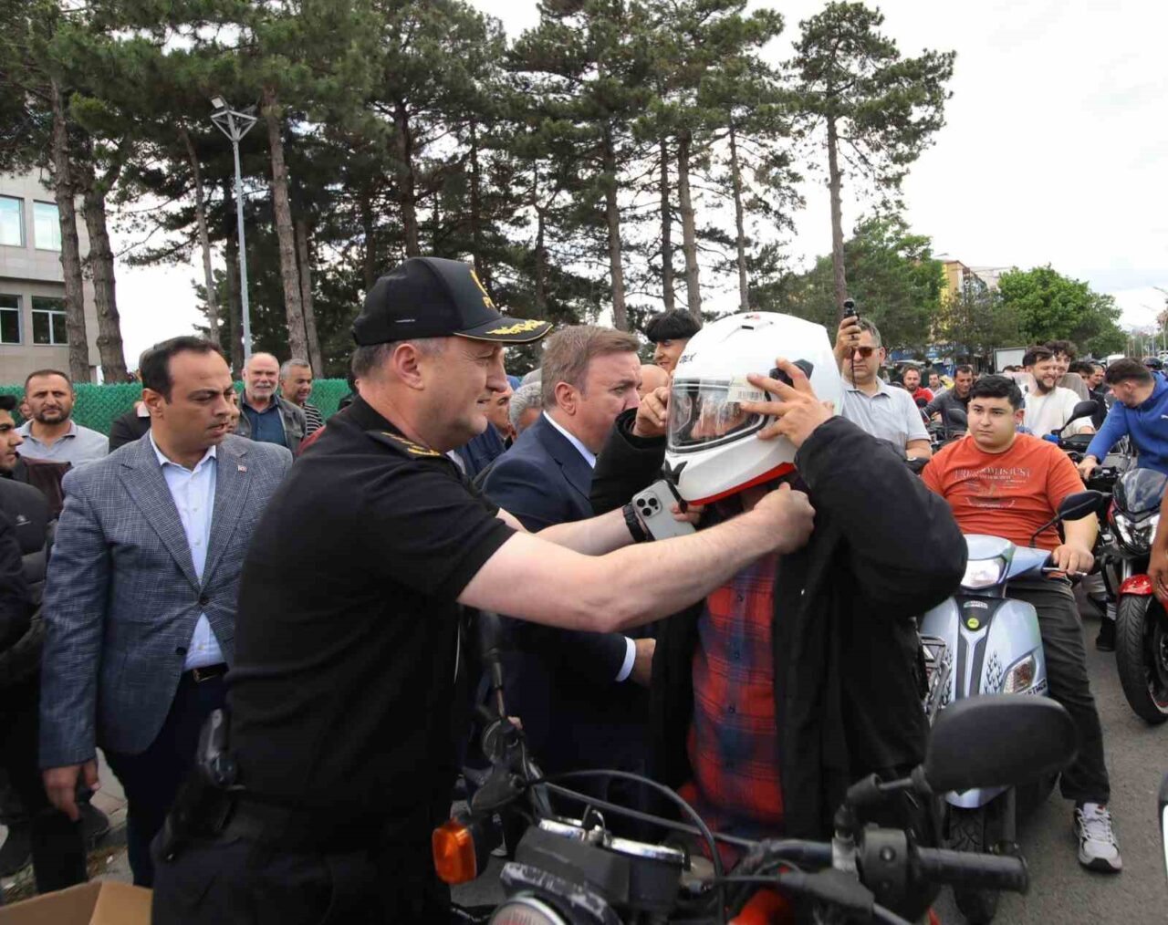 Erzincan Valiliği öncülüğünde, İl Jandarma Komutanlığı ve İl Emniyet Müdürlüğü işbirliğinde trafikte farkındalık oluşturmak ve sürücü güvenliğini artırmak amacıyla düzenlenen etkinlik kapsamında, kaskı olmayan motosiklet kullanıcılarına ücretsiz kask dağıtıldı.
