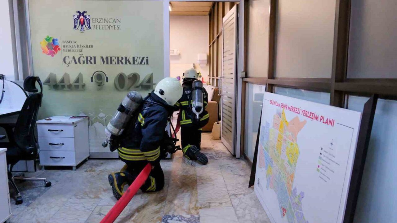 Senaryo gereği belediye çağrı merkezinde çıkan yangın üzerine bina alarmı devreye girdi ve 112 Acil Çağrı Merkezine bilgi verildi. Hızla olay yerine ulaşan Erzincan Belediyesi İtfaiye Müdürlüğü ekipleri, yangına anında müdahale ederek, söndürme ve soğutma çalışmalarını tamamladı.