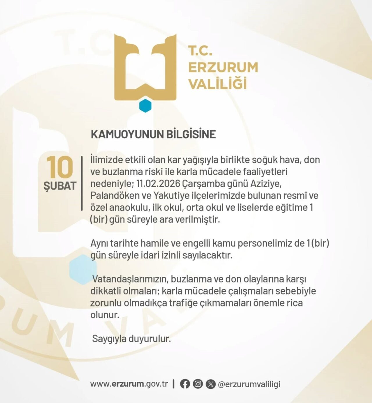 Erzurum Valiliği tarafından konu ile ilgili yapılan açıklamada, “İlimizde etkili olan kar yağışıyla birlikte soğuk hava, don ve buzlanma riski ile karla mücadele faaliyetleri nedeniyle; 11.02.2026 Çarşamba günü Aziziye, Palandöken ve Yakutiye ilçelerimizde bulunan resmî ve özel anaokulu, ilk okul, orta okul ve liselerde eğitime 1 (bir) gün süreyle ara verilmiştir. Aynı tarihte hamile ve engelli kamu personelimiz de 1(bir) gün süreyle idari izinli sayılacaktır. Vatandaşlarımızın, buzlanma ve don olaylarına karşı dikkatli olmaları; karla mücadele çalışmaları sebebiyle zorunlu olmadıkça trafiğe çıkmamaları önemle rica olunur” denildi.