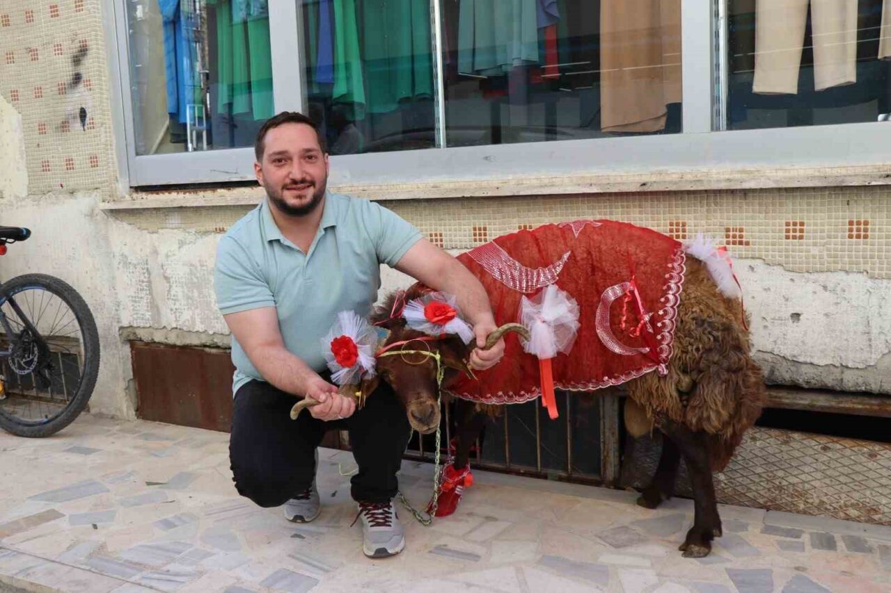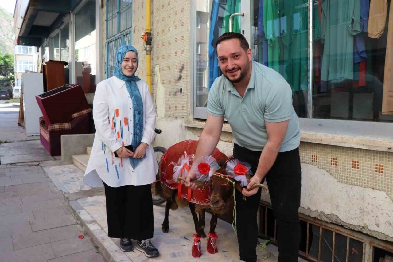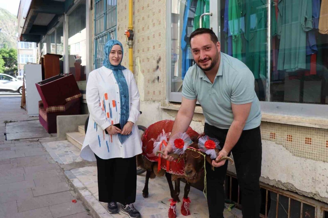 Erzurum’da ikamet eden Doktor Muhammet Enes Batman, nişanlısı Sema Coşkun için özel olarak süslediği kurbanlık koçu hazırlayıp ailesiyle birlikte Oltu’daki kız evine teslim etti. Yöre geleneğine göre nişanlı gençler, bayram öncesinde nişanlılarına süslenmiş kurbanlık koç hediye ediyor. Bu kapsamda damat adayı Muhammet Enes Batman, aldığı koçun boynuzlarına altın bilezik takarak onu özenle süsledi.