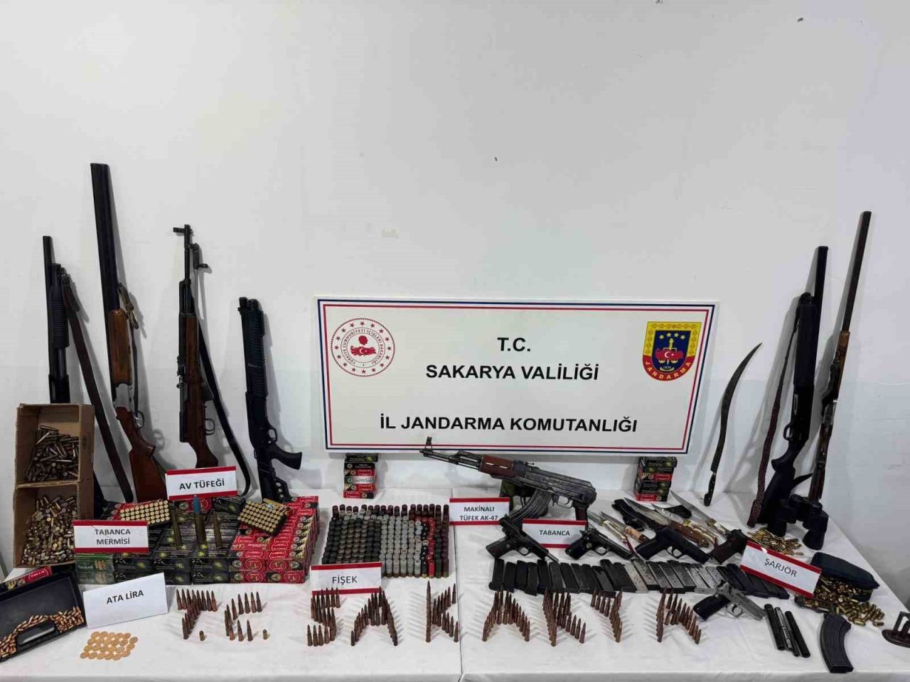 Sakarya İl Jandarma Komutanlığı Kaçakçılık Suçlarıyla Mücadele ekiplerince, Cumhuriyet Başsavcılığı koordinesinde 11 Eylül günü Geyve’de operasyon gerçekleştirildi. Y.G. (52) isimli şahsın ev ve eklentilerinde yapılan aramalarda; 1 adet kalaşnikof uzun namlulu silah, 1 adet yivli keskin nişancı tüfeği, 2 adet kalaşnikof şarjörü, 5 adet ruhsatsız tabanca, 25 adet tabanca şarjörü, 6 bin 251 adet 9 milimetre tabanca fişeği, 675 adet 45 milimetre tabanca fişeği, 58 adet 7.65 milimetre tabanca fişeği, 332 adet 7.62 milimetre fişek, 5 adet ruhsatsız av tüfeği, 299 adet av tüfeği fişeği, 10 adet kama (kesici-delici alet), 3 adet 5.56 milimetre fişek, 23 adet Ata lira altın, muhtelif sayıda silah yedek parçası ve tamir kiti ele geçirildi. Operasyon çerçevesinde gözaltına alınan Y.G., işlemlerinin ardından çıkarıldığı mahkemece tutuklanarak cezaevine gönderildi.
