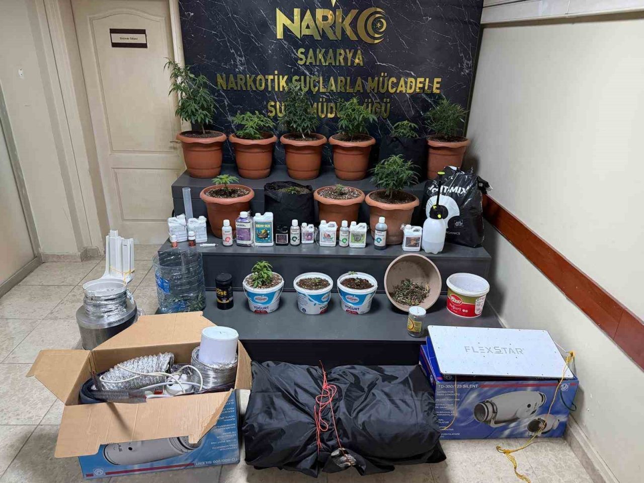 Geyve Cumhuriyet Başsavcılığının koordinesinde Sakarya İl Emniyet Müdürlüğü Narkotik Suçlarla Mücadele Şube Müdürlüğü ekiplerince Geyve ilçesinde evin bir odasını adeta uyuşturucu üretim serasına çeviren iki şüpheli yakalanarak gözaltına alındı. Yapılan aramalarda, 13 adet saksı içerisinde 15 adet (5-30 cm) Hint keneviri, kurtulmaya bırakılmış bir miktar kenevir bitkisi, kenevir yetiştirmede kullanılan 1 adet çadır, muhtelif sıvı ve toz halinde gübreler, 4 adet LED armetür, budama için kullanılan makas, 2 adet havalandırma fanı, 1 adet zamanlayıcı piriz, 1 adet nemlendirme cihazı, 1 adet ilaçlama spreyi ve yetiştirmede kullanılan bitki toprağı ele geçirildi.