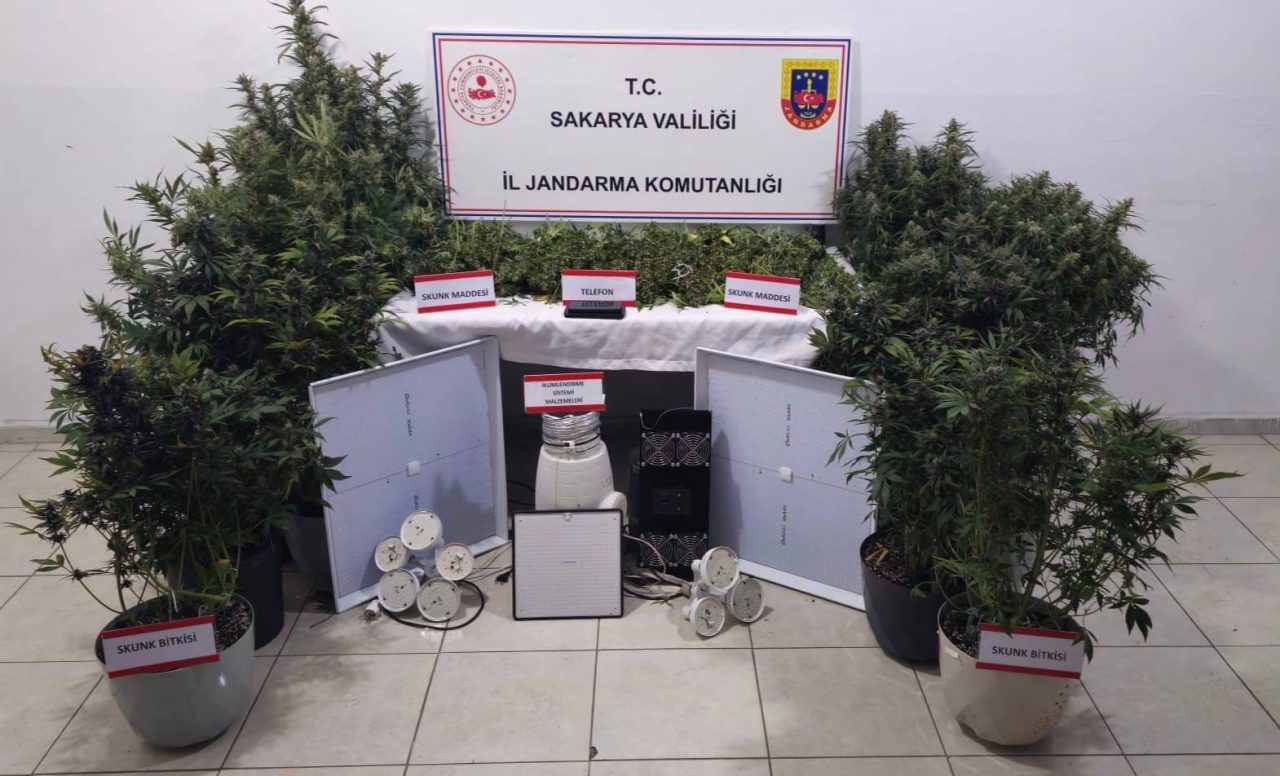 Sakarya İl Jandarma Komutanlığı sorumluluk bölgesinde uyuşturucuya geçit vermiyor. Bu çerçevede Geyve ilçesinde adeta uyuşturucu imalathanesine çevrilen eve düzenlenen operasyonda Ö.P. (29) ve M.K. (27) isimli şüpheliler gözaltına alındı. Evde yapılan aramalarda, 14 kök skunk bitkisi, 5.100 gram skunk maddesi, 1 adet iklimlendirme sistemi, muhtelif sayıda bitki besin maddeleri, 3 adet cep telefonu, 42 adet içime hazır bonzai, 5 gram bonzai maddesi, 1 adet kenevir tohumu, 1 adet kubar esrar, 1 adet ruhsatsız av tüfeği, 1 adet havalı tüfek, 1 adet havalı tabanca ele geçirildi. Gözaltına alınan M.K. adli kontrol şartıyla serbest bırakılırken, Ö.P. tutuklanarak cezaevine sevk edildi.